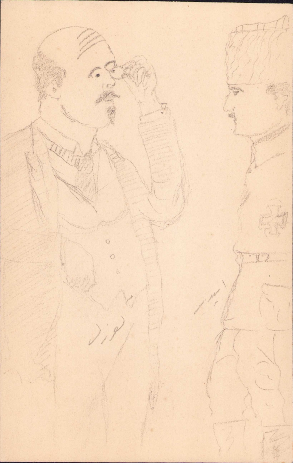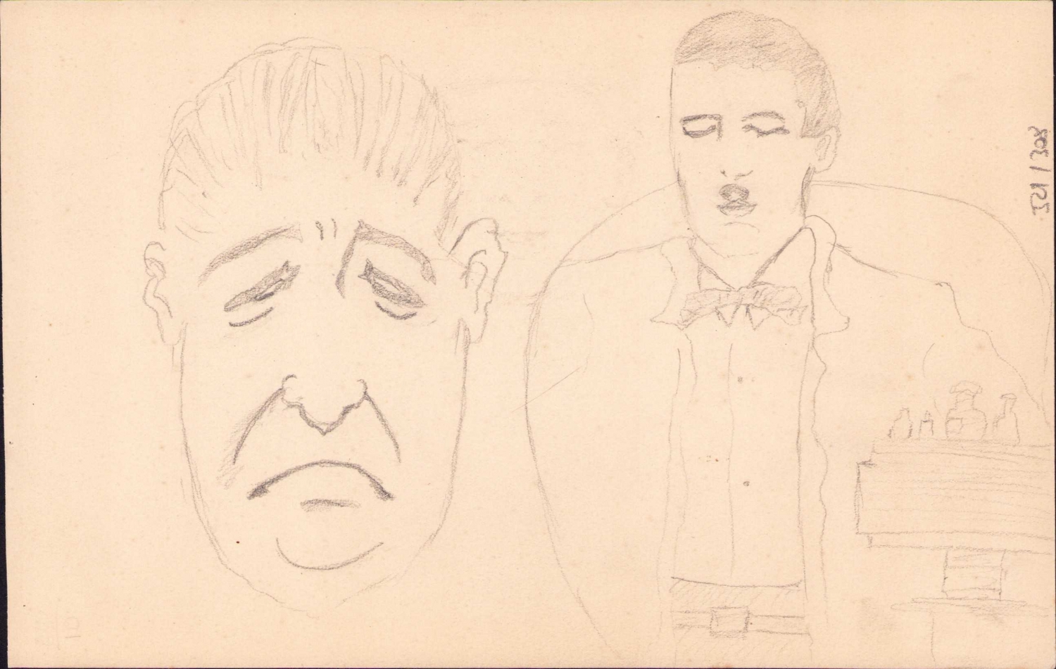 Kara kalem, madalyalı asker ve monogl gözlüklü erkek tip çizimleri, 22xs13,5 cm.