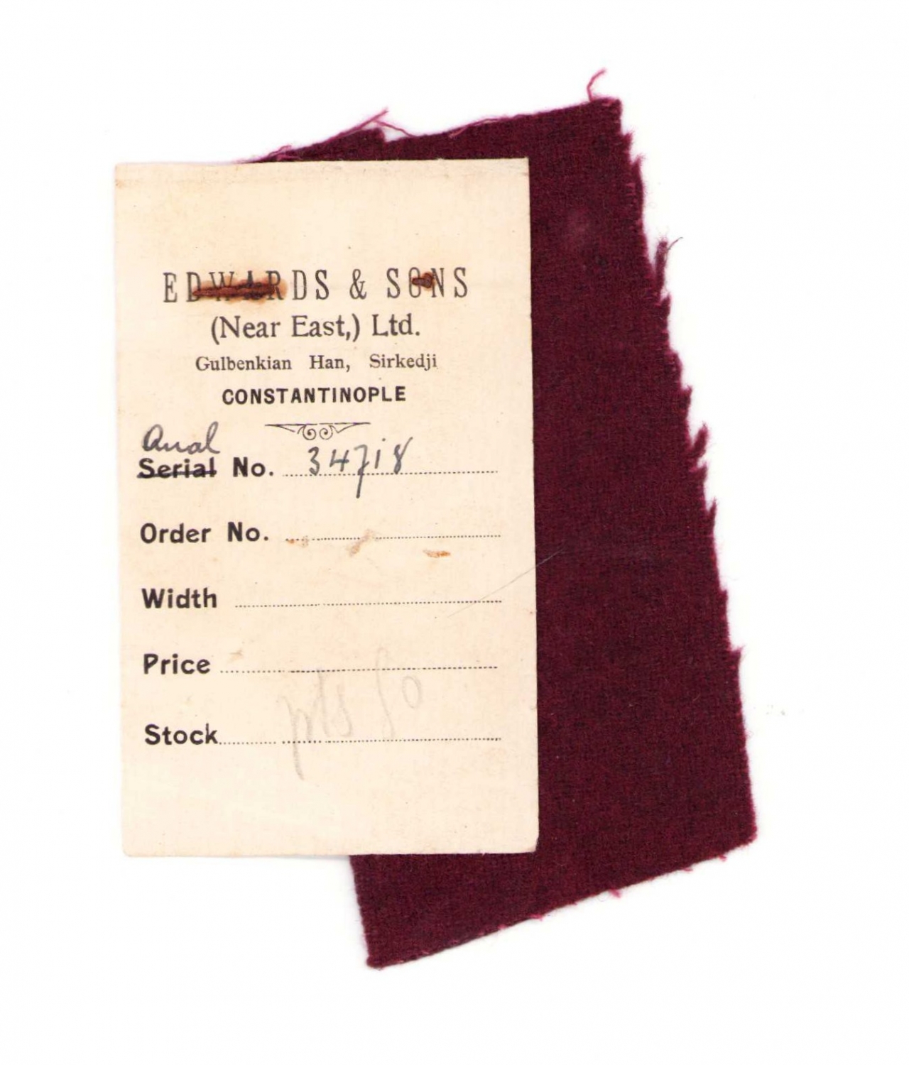 Constantinople Sirkeci Gülbenkyan Han'da Edwards&Sons Near East Ltd. kumaş parçası, seri nolu, 10x7,5 cm.