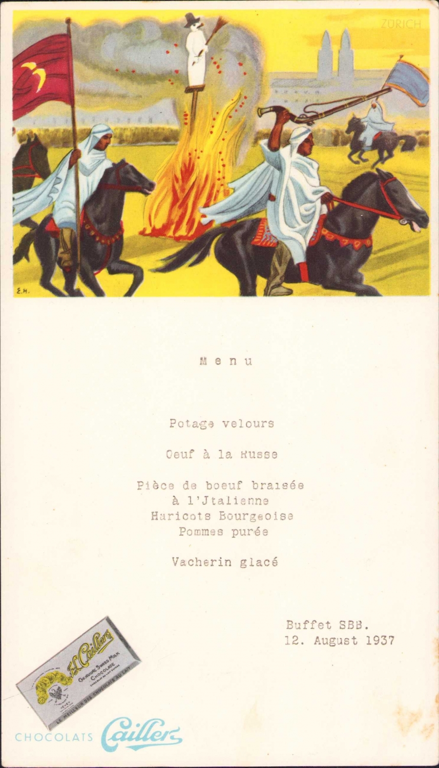 Fransızca menü, Chocolats Caillers, 1937 tarihli, 12,5x27 cm.