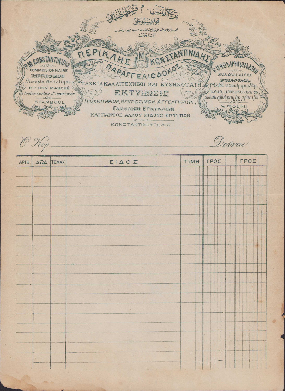 Osmanlıca, Ermenice, Rumca, Fransızca 4 dilde antetli Rum iş yeri faturası