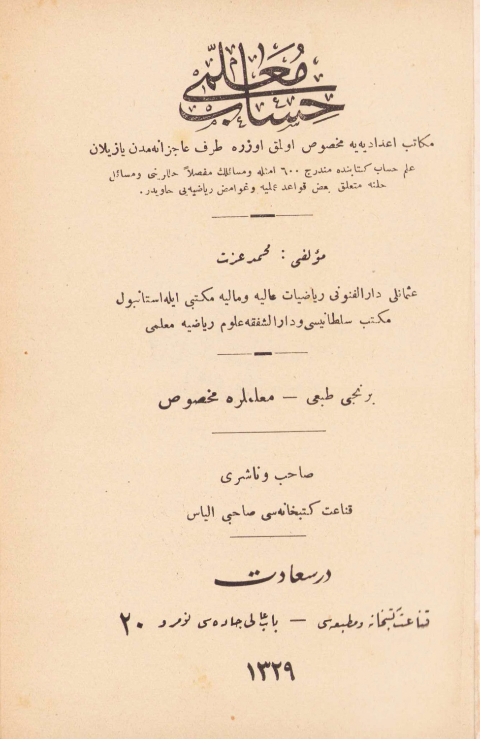 Hesap Muallimi, Mehmet İzzet, Dersaadet-Kanaat Kütüphanesi Matbaası, 1913 tarihli Osmanlıca, 391 sayfa, 12x18cm
