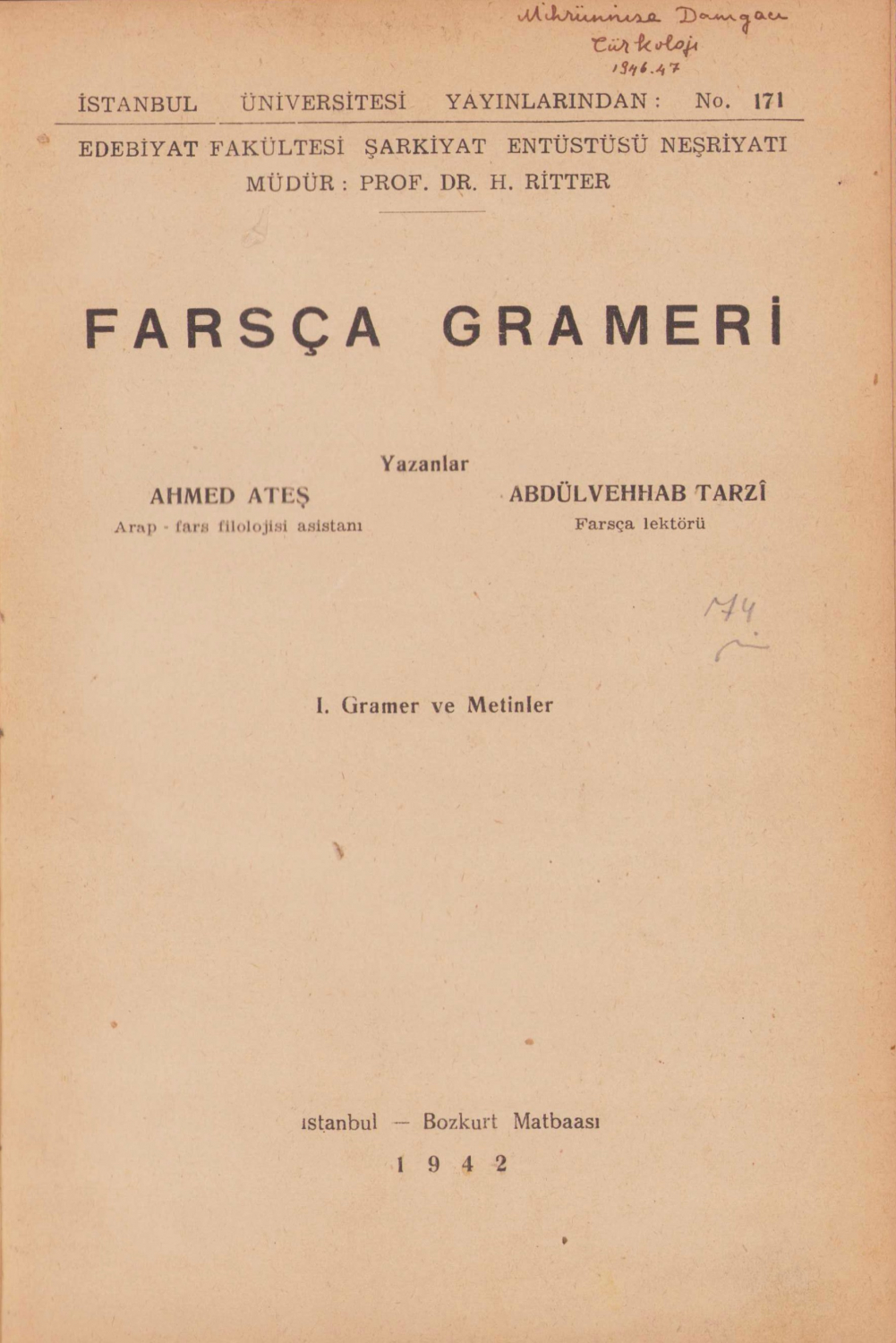 Farsça Grameri - I Gramer ve Metinler, Ahmet Ateş-Abdülvehhab Tarzi, İstanbul-Bozkurt Matbaası, 1942 tarihli Farsça Ve Türkçe iki dilli, 197 sayfa, 17x23cm