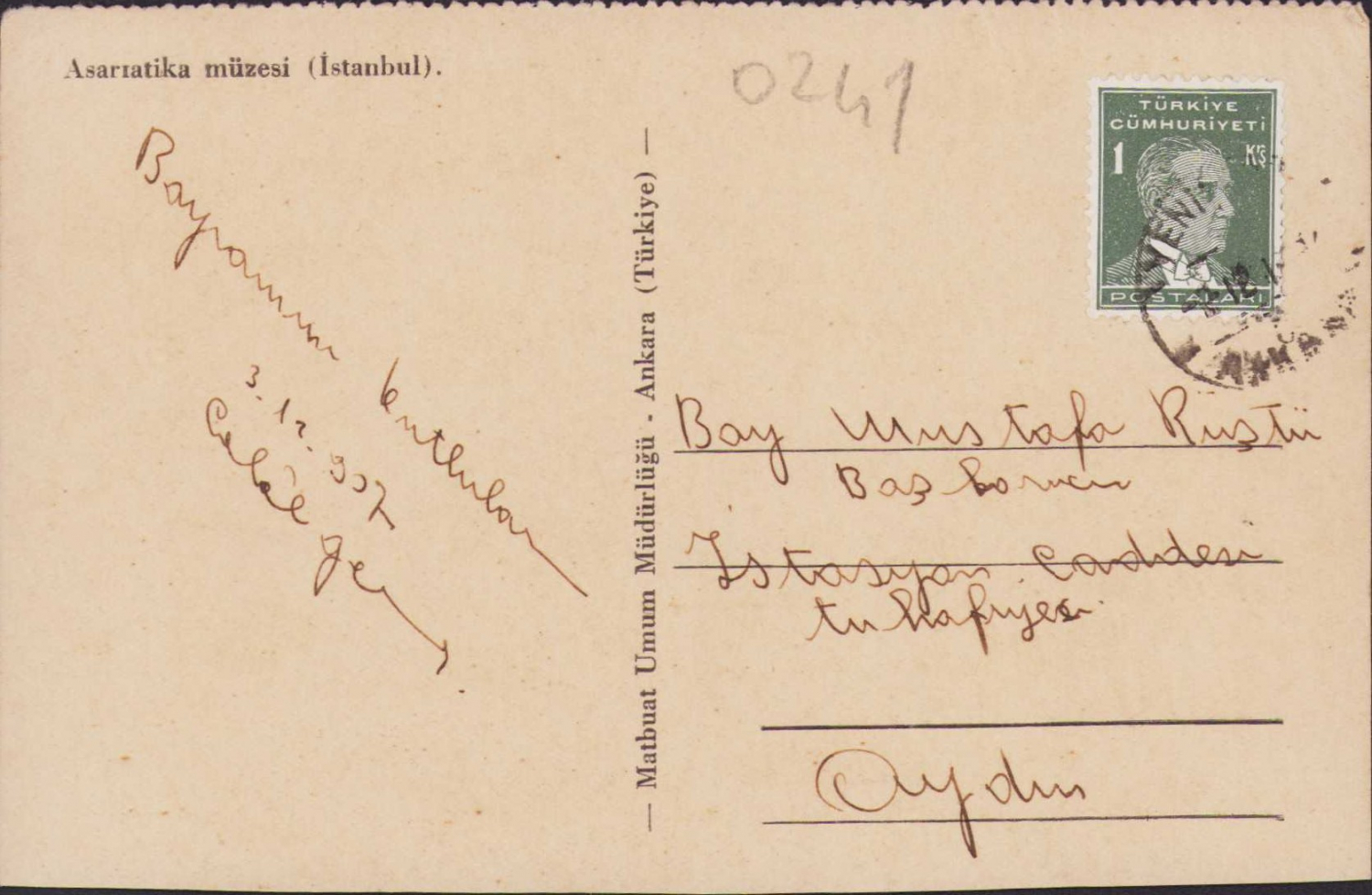 İstanbul Asarıatika Müzesi, Ankara baskısı, pullu, postadan geçmiş, Aydın adresli