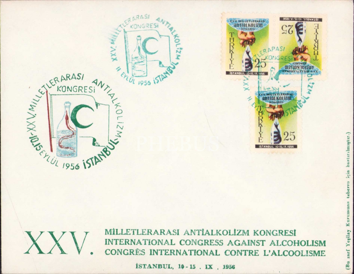 XXV. Milletlerarası Antialkolizm Kongresi İlk Gün Zarfı, İstanbul, 1956 tarihli, damgalı ve pullu, 16x12,5 cm.