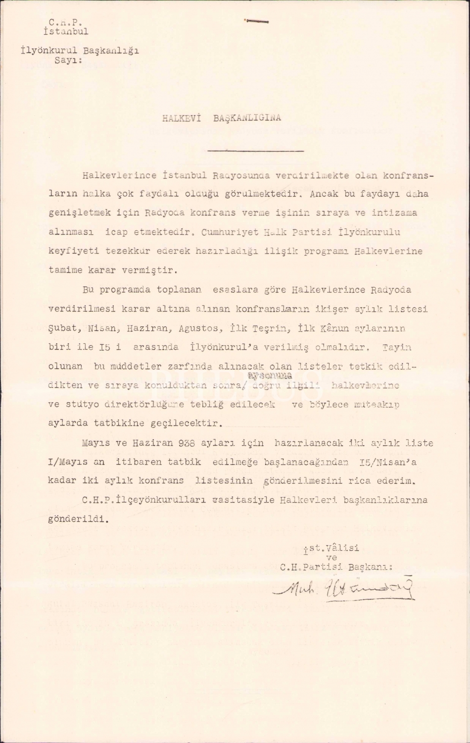 İstanbul Valisi ve C.H.P. Başkanı Muhittin Üstündağ tarafından Halkevi Başkanlığı'na gönderdiğ evrak, 2 sayfa, 21x33 cm.