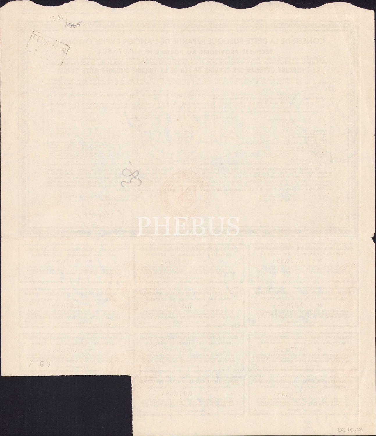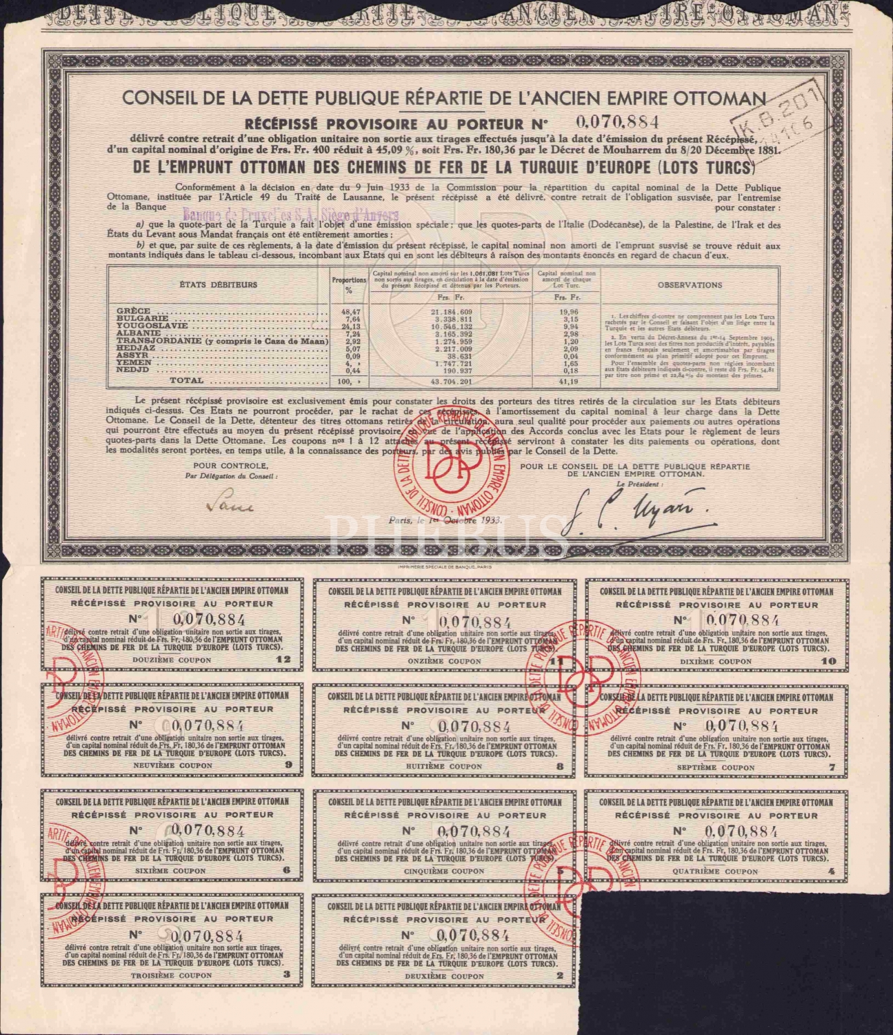 Conseil De La Dette Publique Repartie De L'Ancien Empire Ottoman'a ait hisse senedi, Fransızca, 1933 tarihli, 27x32 cm.