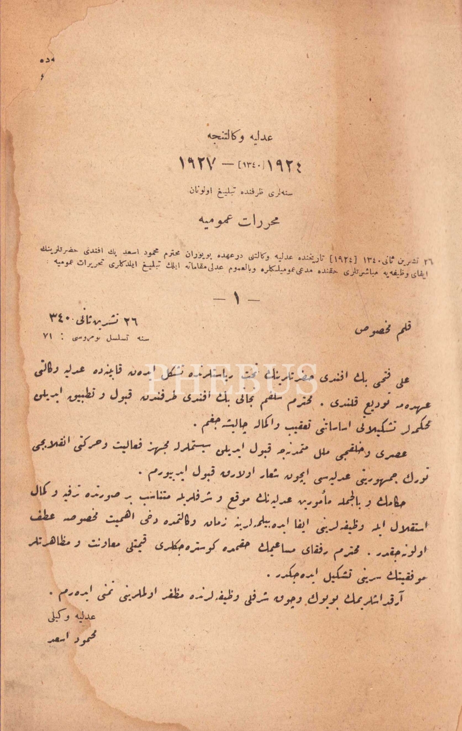Osmanlıca Adliye Vekaleti'nce 1924-1927 Seneleri Zarfında Tebliğ Olunan Muharirât-ı Umumiye, 781 sayfa+48 sayfa fihrist, 16x24, yeni cildinde, bazı sayfaları haliyle.