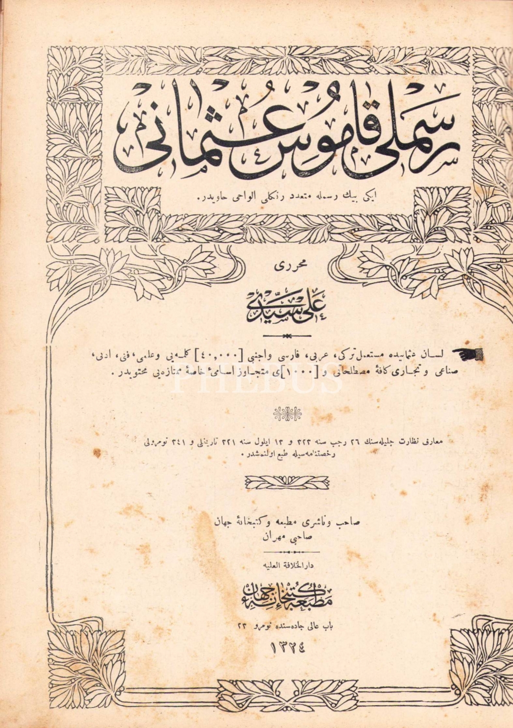 Resimli Kamus-ı Osmani, Muharriri: Ali Seydi, Matbaa-i Kitaphane-i Cihan, 1324, son kısmı eksik, 381 sayfa, 18,5x24 cm.