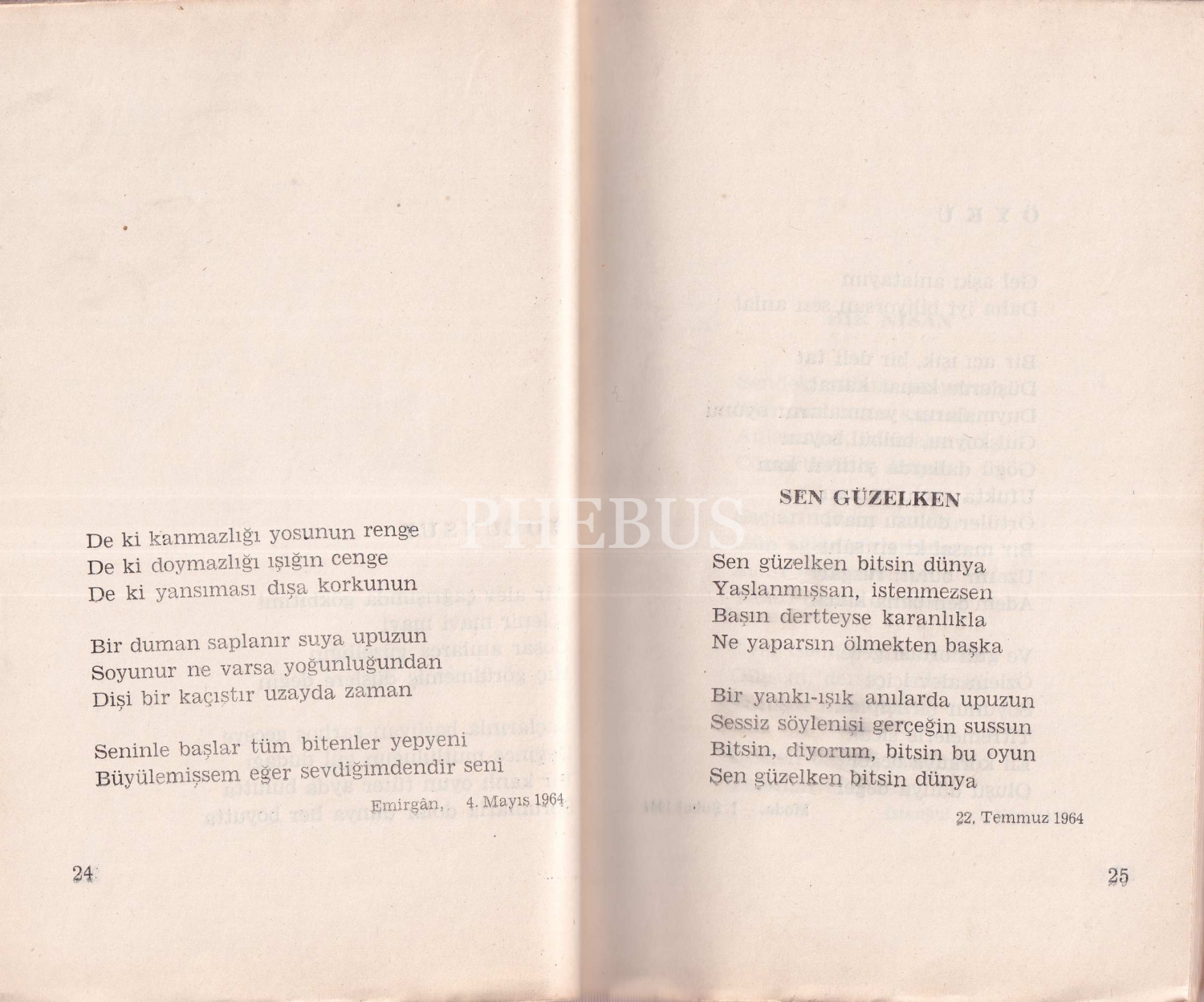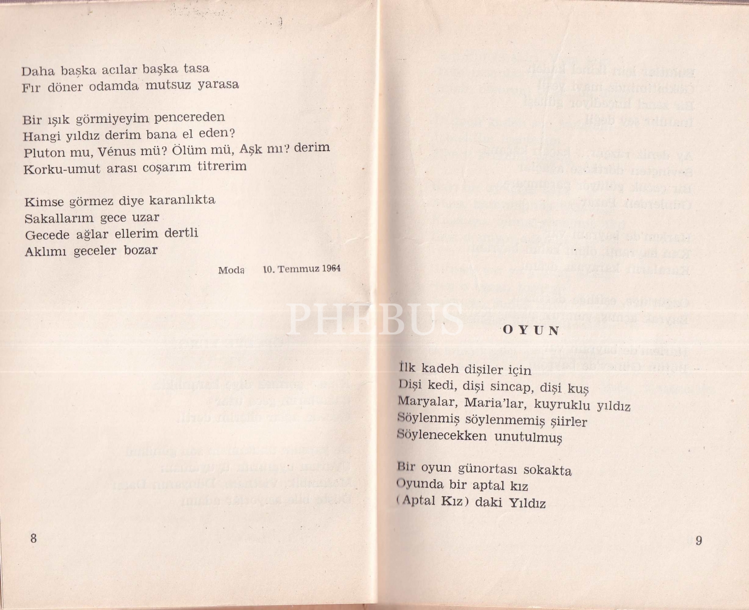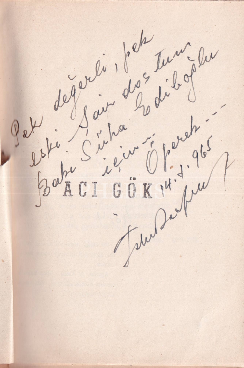 İthaf, "Pek değerli, pek eski şair dostum Baki Süha Ediboğlu için, öperek, 14. 1. 965 İskender Fikret Akdora" şeklindedir.