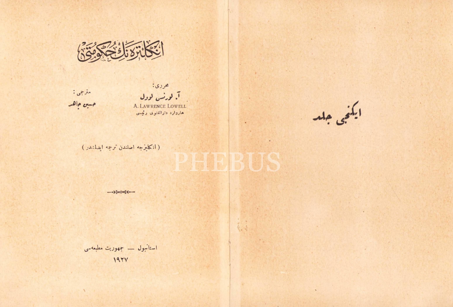 İngiltere'nin Hükümeti, Muharriri A. Lawrance Lowell [Harvard Darülfünun Reisi], Mütercimi: Hüseyin Cahid, İkinci Cild, İstanbul, Cumhuriyet Matbaası, 1927 tarihli, cildi haliyle, 422 sayfa, 14x20 cm.