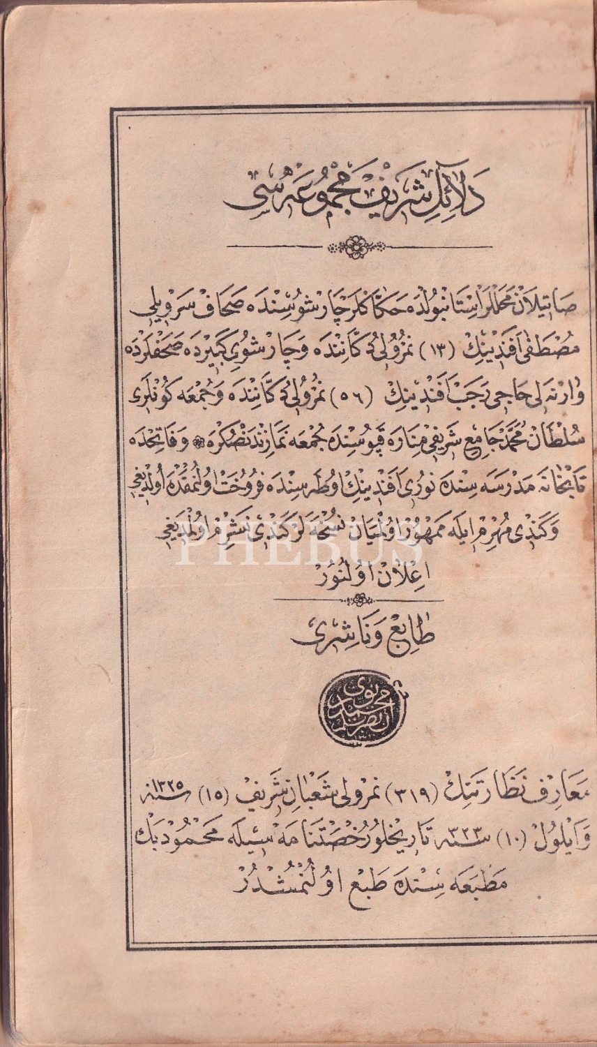 Delail-i Şerif Mecmuası, 1323 tarihli, Mahmud Bey Matbaası, Arapça [İlk 23 Sayfa Türkçe], cildi haliyle, Tab' u Naşiri: Mehmed Nuri, 287 sayfa, 12x19 cm.