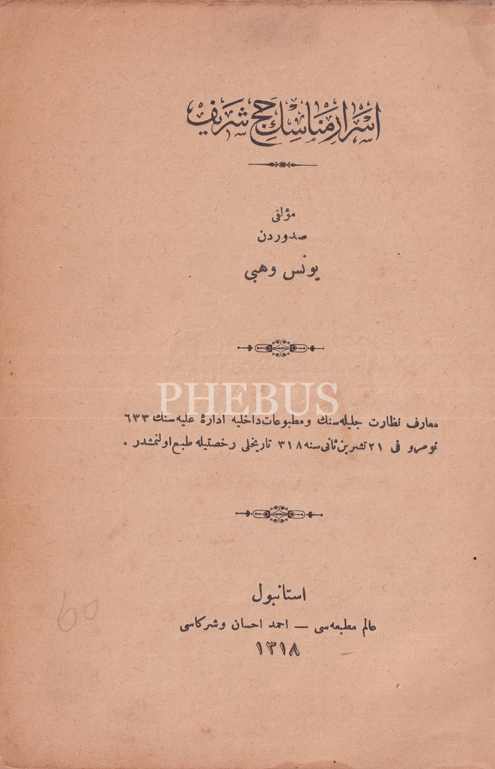 Esrar-ı Menasik-i Hac-ı Şerif, Müellifi: Yusuf Vehbi, İstanbul, Ahmed İhsan ve Şürekası, Alem Matbaası, 1318 tarihli, 16 sayfa, 14x20 cm.