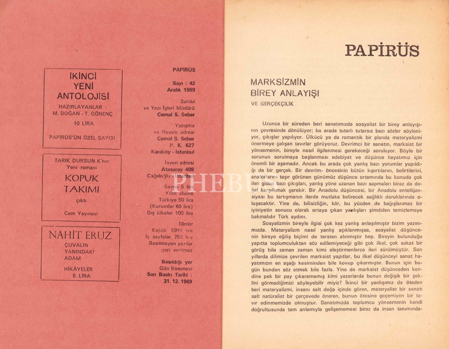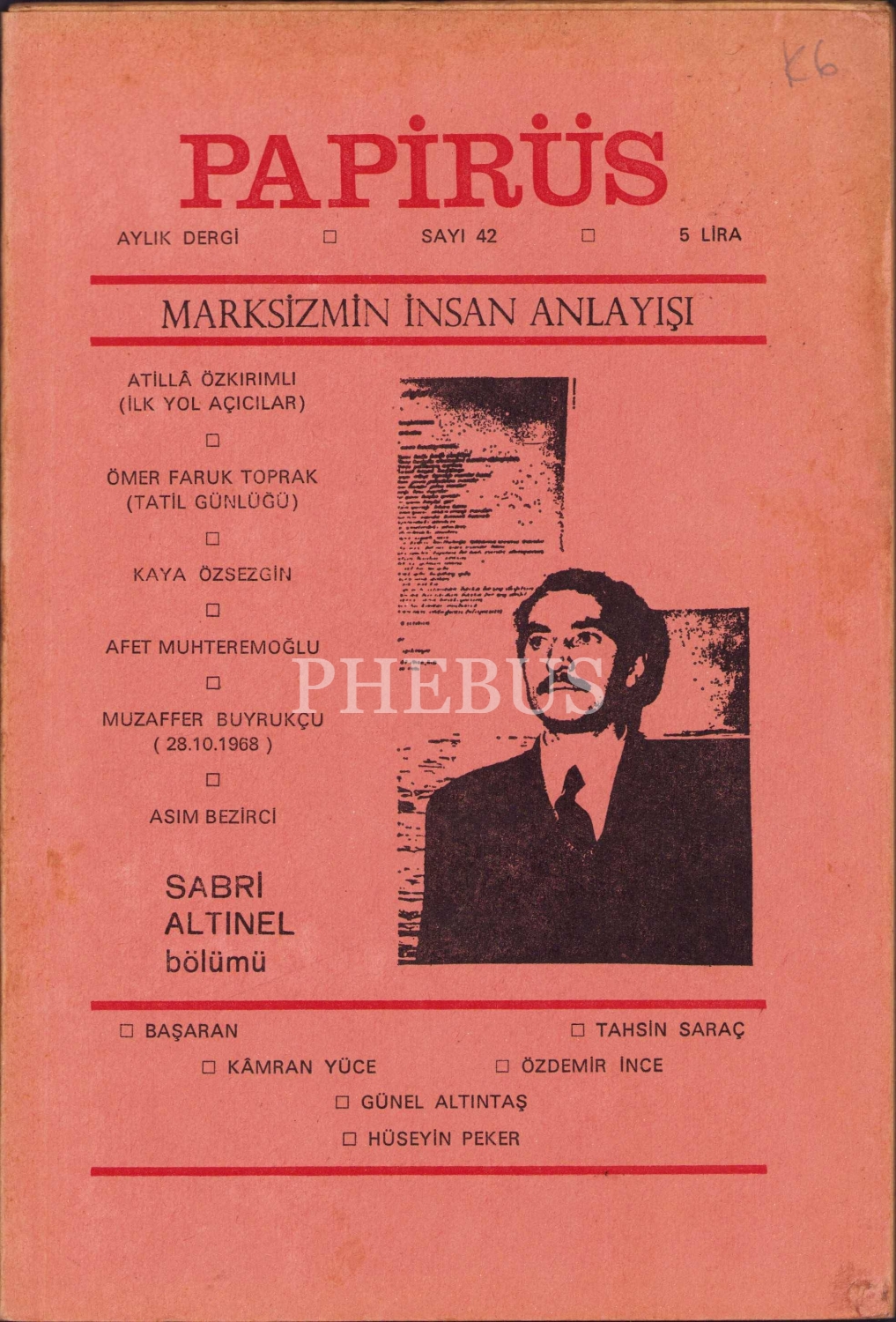 Papirüs, Aylık Dergi, Sayı:42, Kapak Sabri Altınel Bölümü, Marksizmin İnsan Anlayışı, 62 sayfa, 16x24,5 cm.