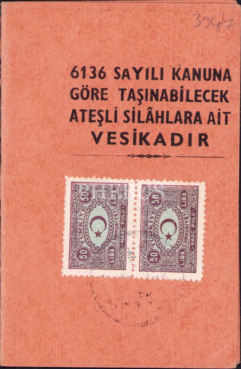 Veterinere verilmiş silah ruhsatı, 8x12 cm.