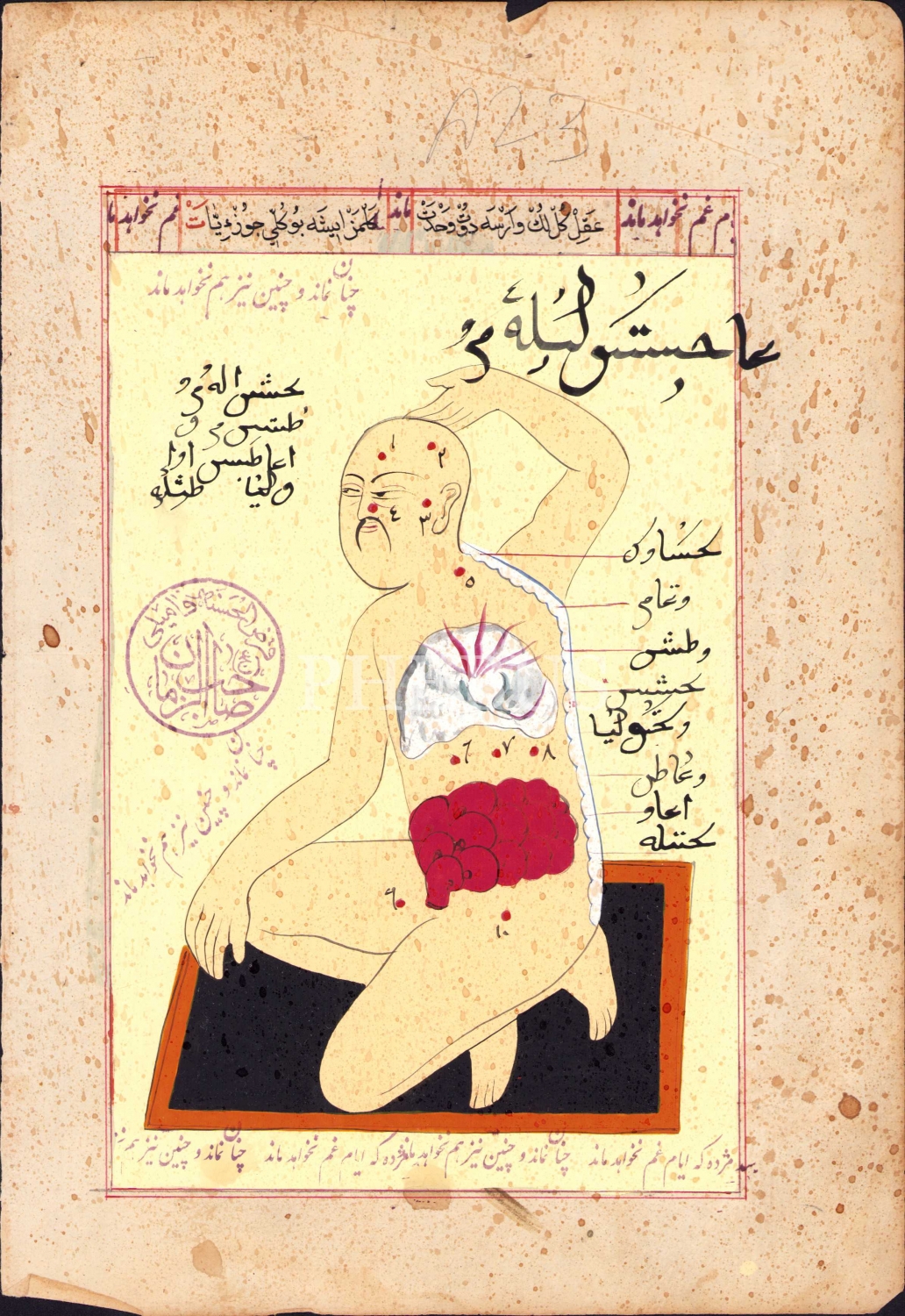Tıp konulu eski kağıt üzerine yeni minyatür çalışması, 20x29 cm.