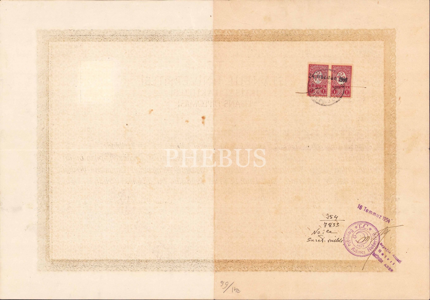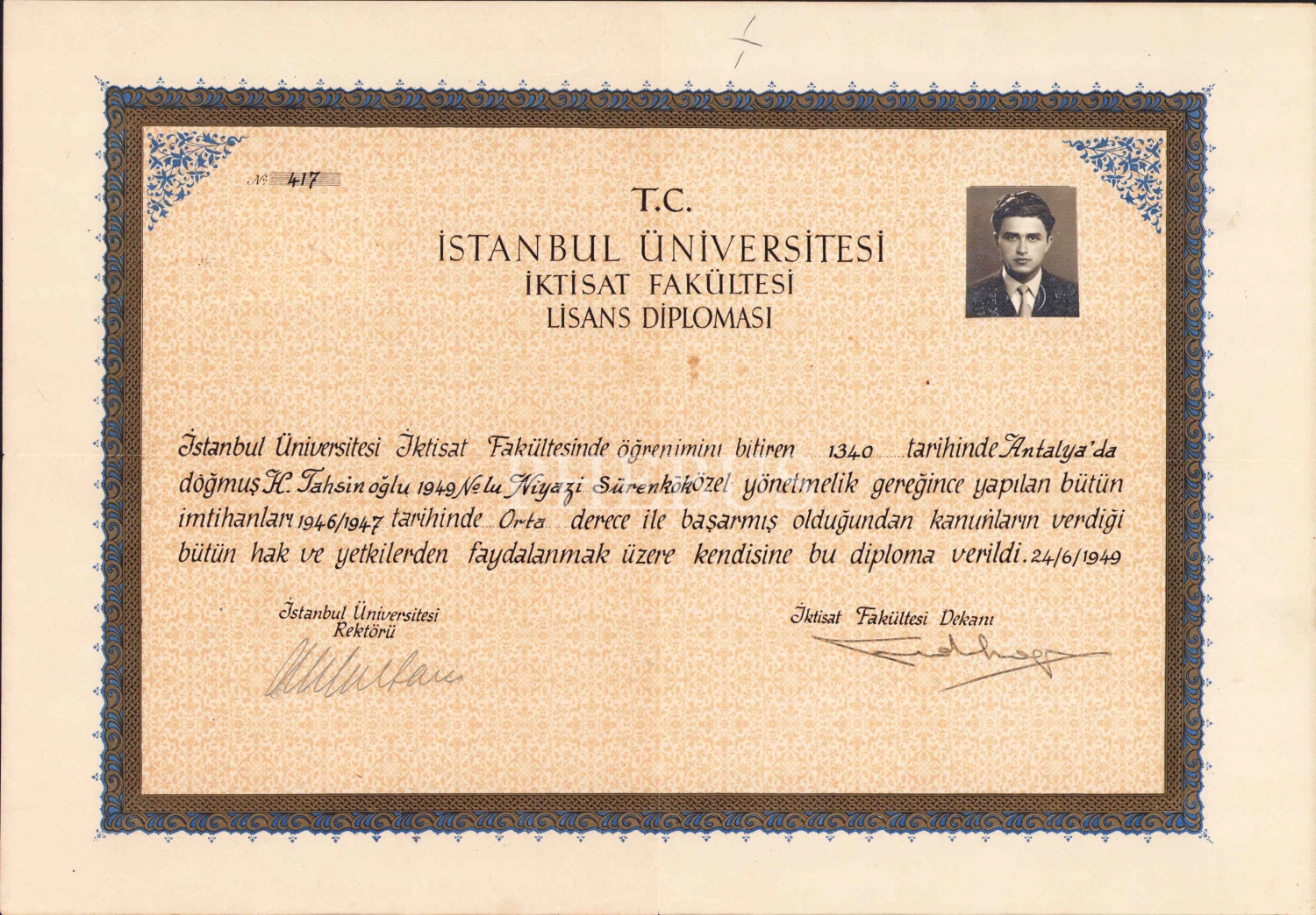 İstanbul Üniversitesi İktisat Fakültesi diploması, 41x28 cm.