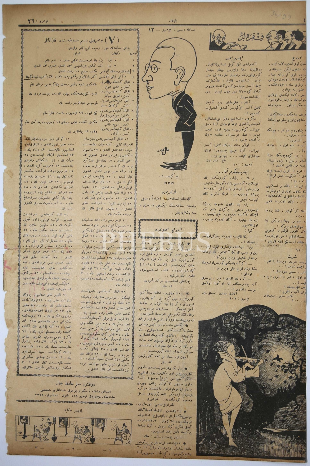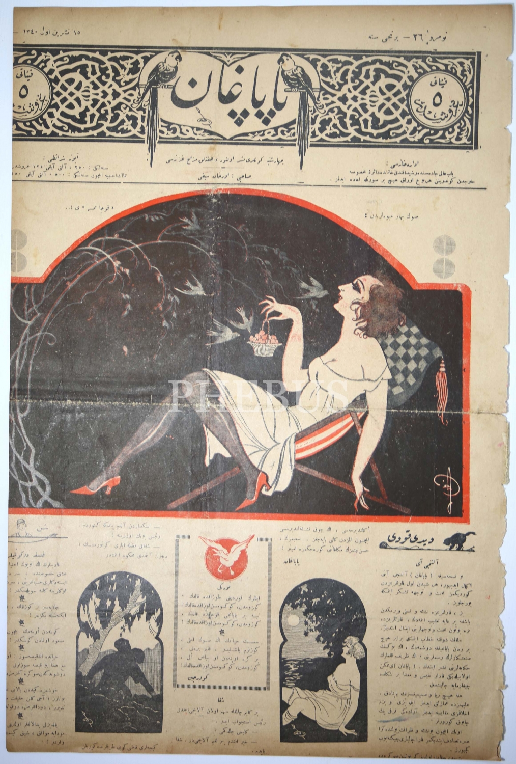 Papağan Dergisi, Numara 26, 15 Teşrin-i Evvel 1340 tarihli, Sahibi: Orhan Seyfi [Orhon], sol kenarı haliyle, Osmanlıca, 4 sayfa, 30x45 cm.