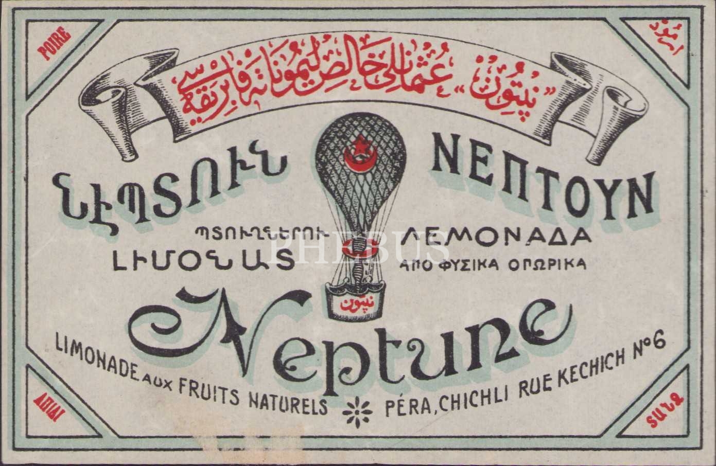 Osmanlıca 'Neptün Osmanlı Halis Limonata Fabrikası' yazılı Ermenice, Fransızca, Rusça etiket, 12x8 cm.