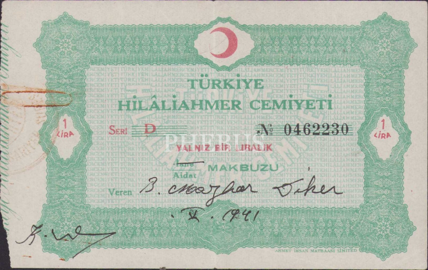 Türkiye Hilal-i Ahmer Cemiyeti Yalnız Bir Liralık Makbuz, 1941 tarihli, 13x8 cm.