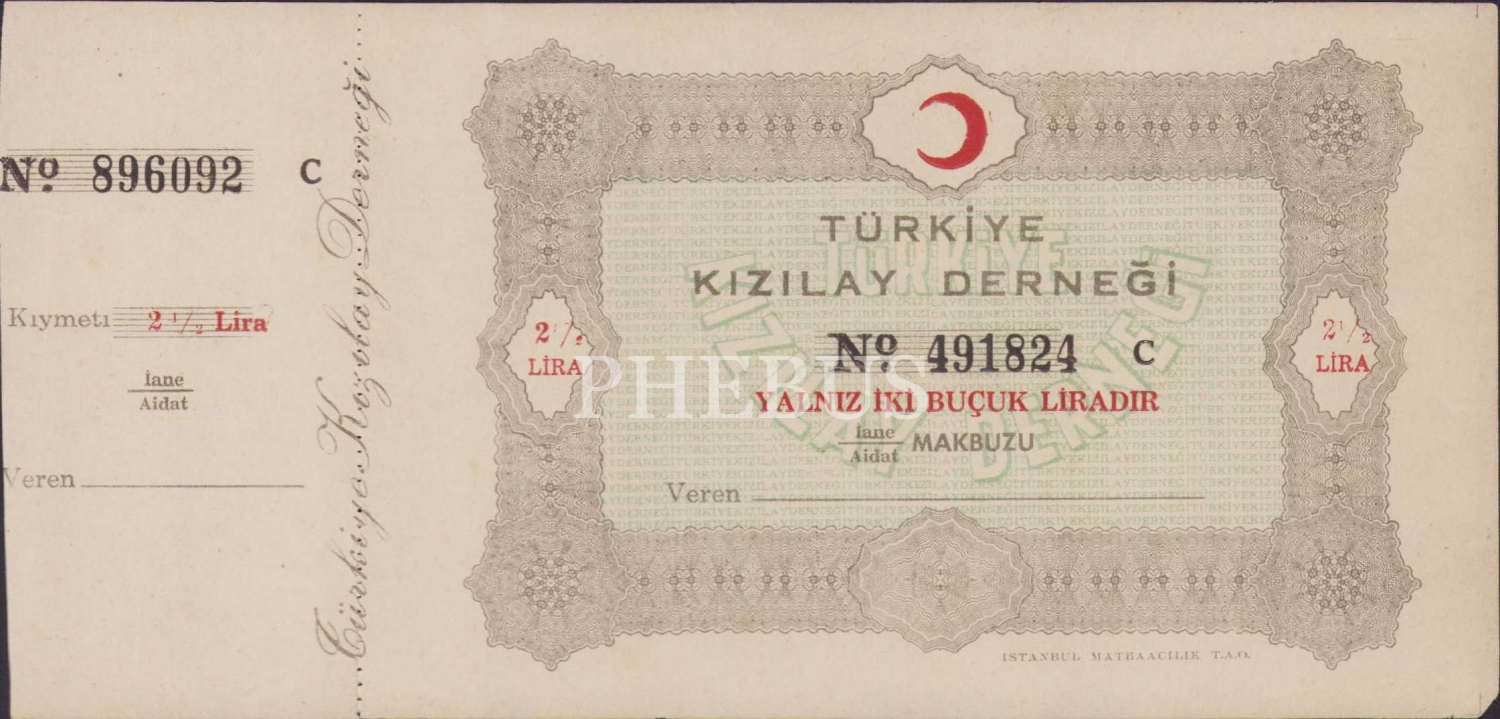 Türkiye Kızılay Derneği İki Buçuk Liralık Makbuz, 19x9 cm.