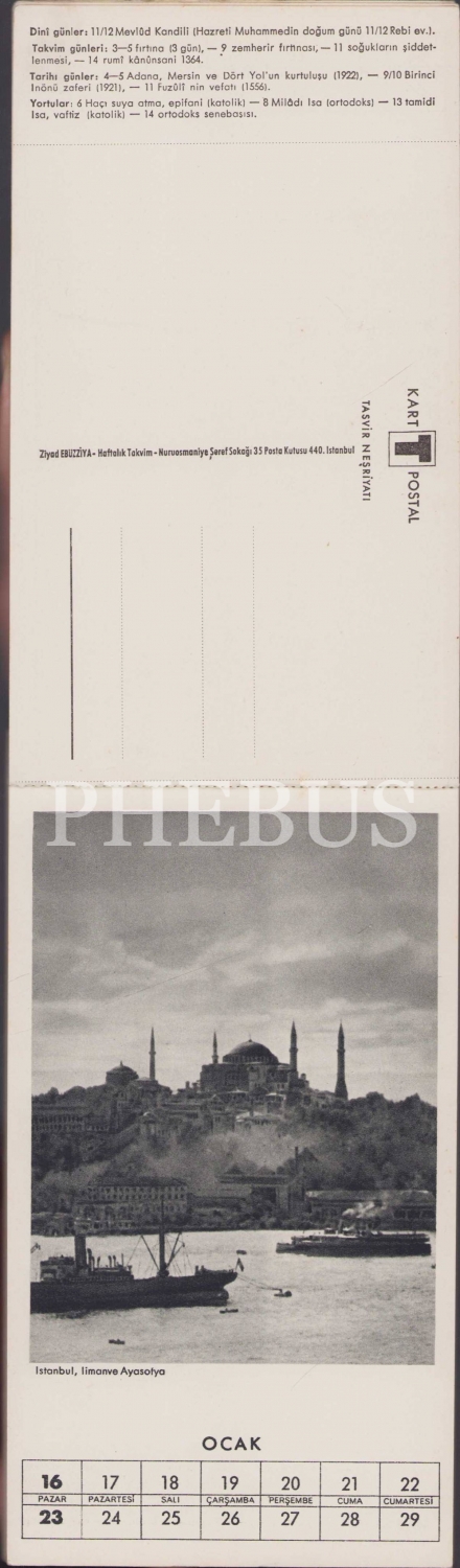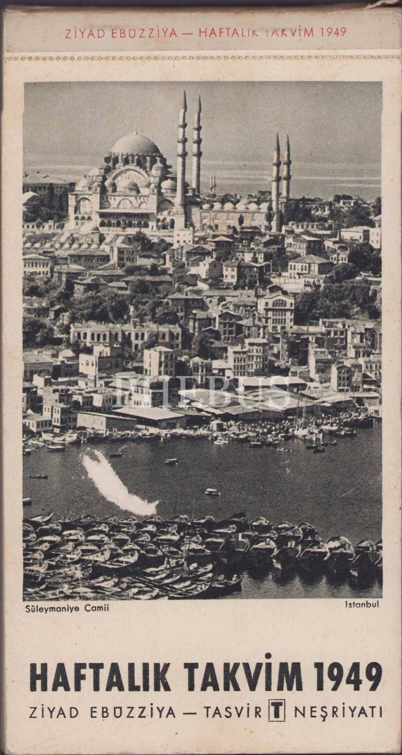 1949 tılına ait Haftalık Takvim, Ziyad Ebüzziya-Tasvir Naşriyat, İstanbul ve Muhtelif şehirlerden fotoğraflarla, 10,5x19,5 cm.