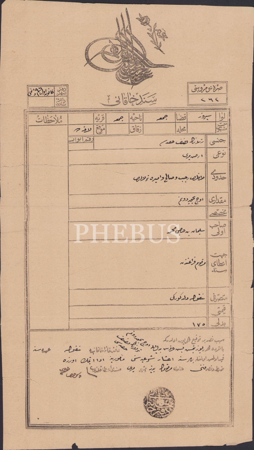 Osmanlıca Sened-i Hakani, Miri Arazi Tarla, Sahib: Süleyman b. Hacı Mehmed, Cuma Kazası, 1298 tarihli, 19x34 cm.