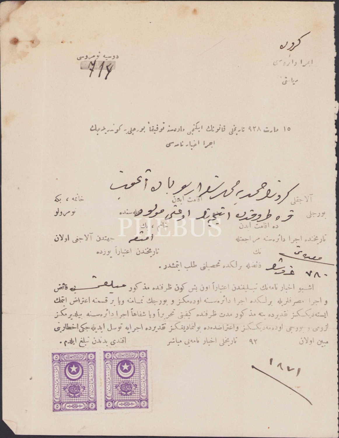 15 Mart 1928 tarihli Osmanlıca İcra İhtarnamesi, İcra Riyaseti Riyaseti antetli, 17x22 cm.
