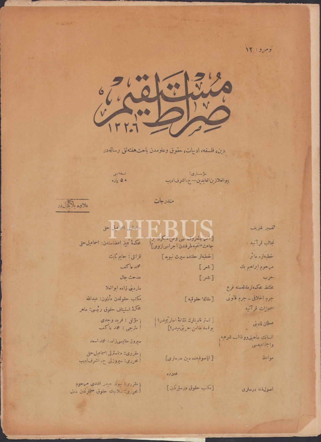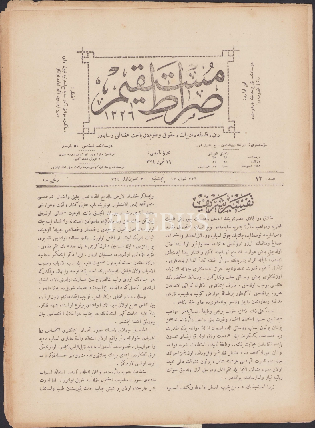 Sıratü'l Müstakim, Numara: 12, 11 Temmuz 1324 tarihli, 25x34,5 cm.