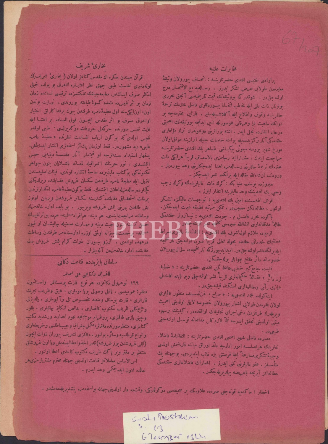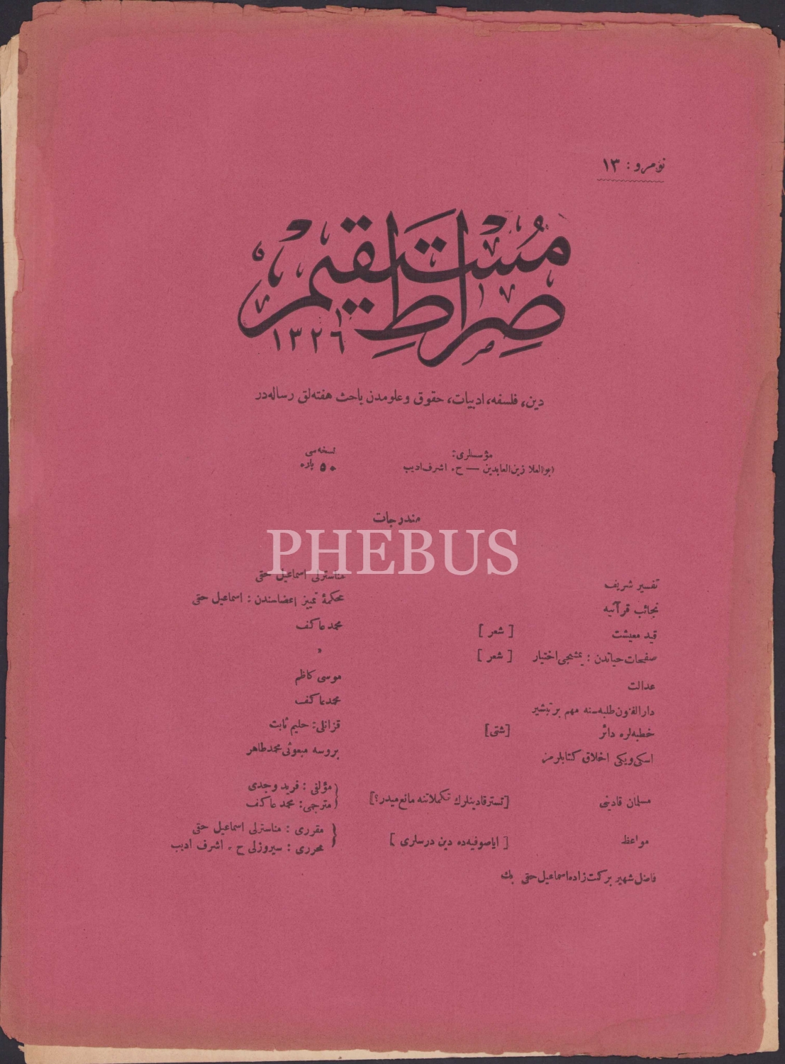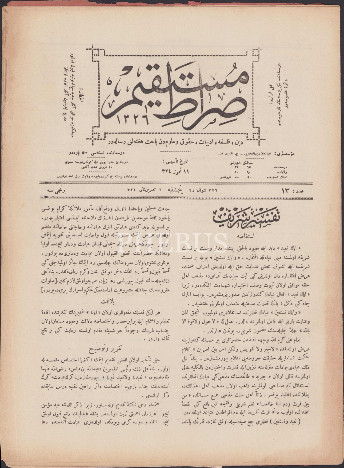 Sıratü'l Müstakim, Numara: 13 Temmuz 1324 tarihli, 25x34,5 cm.