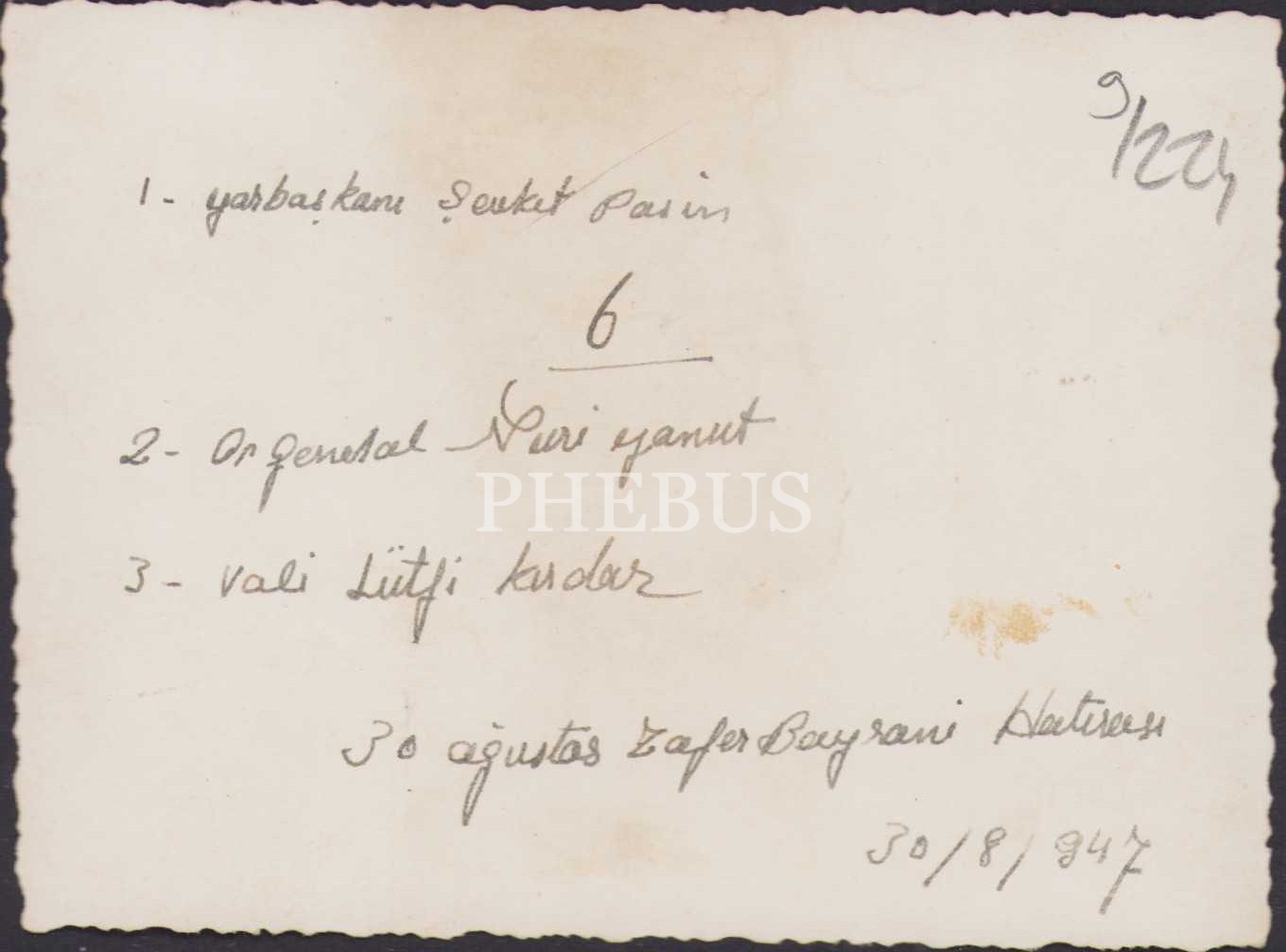 Vali Lütfi Kırdar ve Orgeneral Nuri Yanut 30 Ağustos Zafer Bayramı kutlamalarında, 1947 tarihli, 11,5x8 cm.