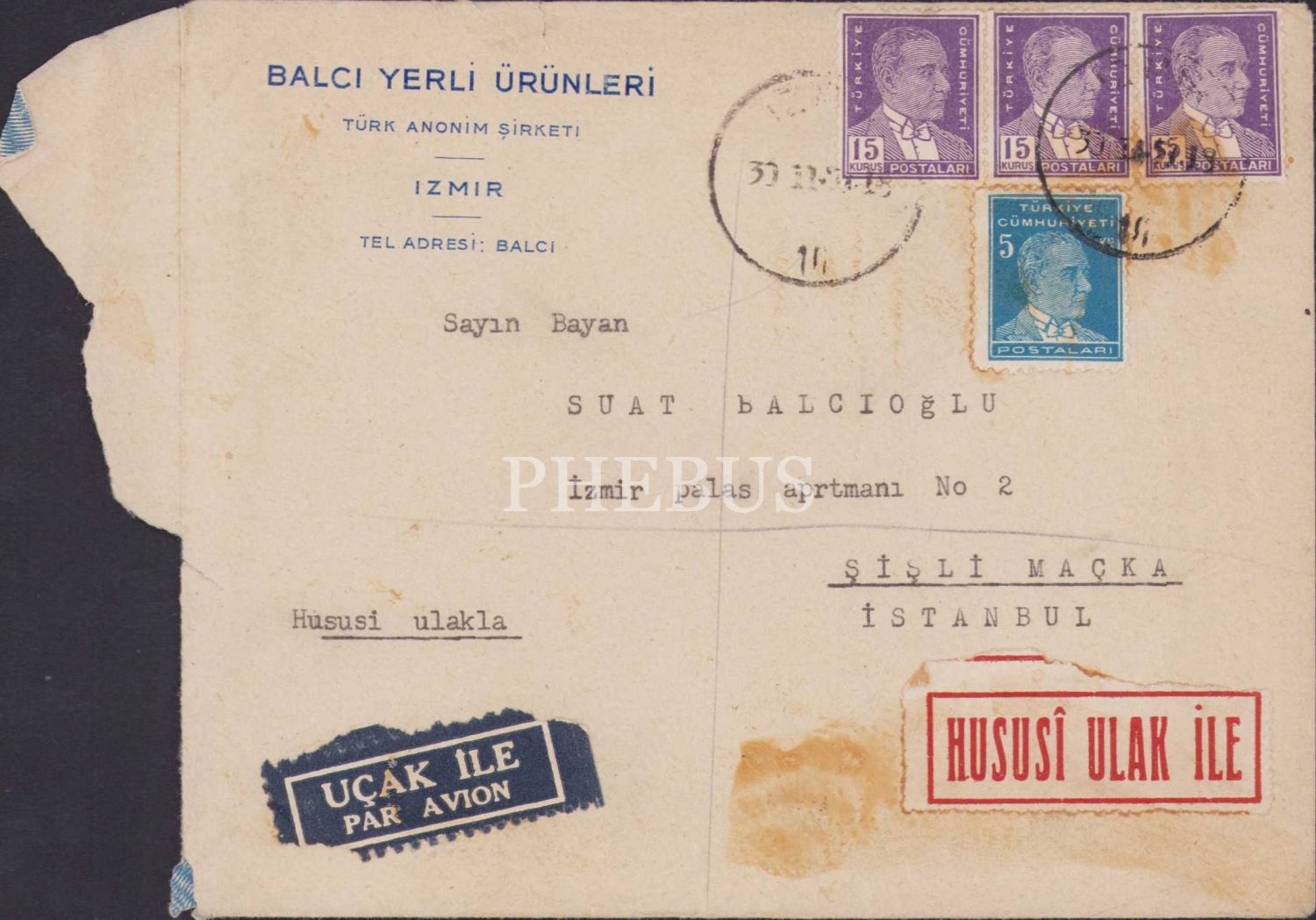 Balcı Yerli Ürünleri antetli postadan geçmiş zarf, Hususi Ulak İle damgalı, 15,5x12,5 cm.