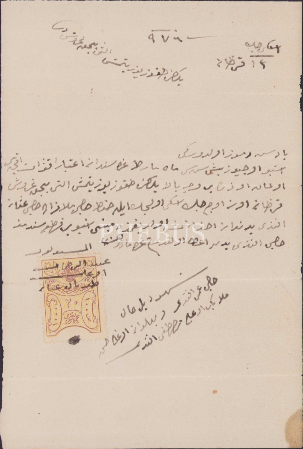 Afyon Sandıklı'da Çay Mahallesi'nden Hacı Ömer Efendi'ye ait Osmanlıca senet, pullu, 12x18 cm.