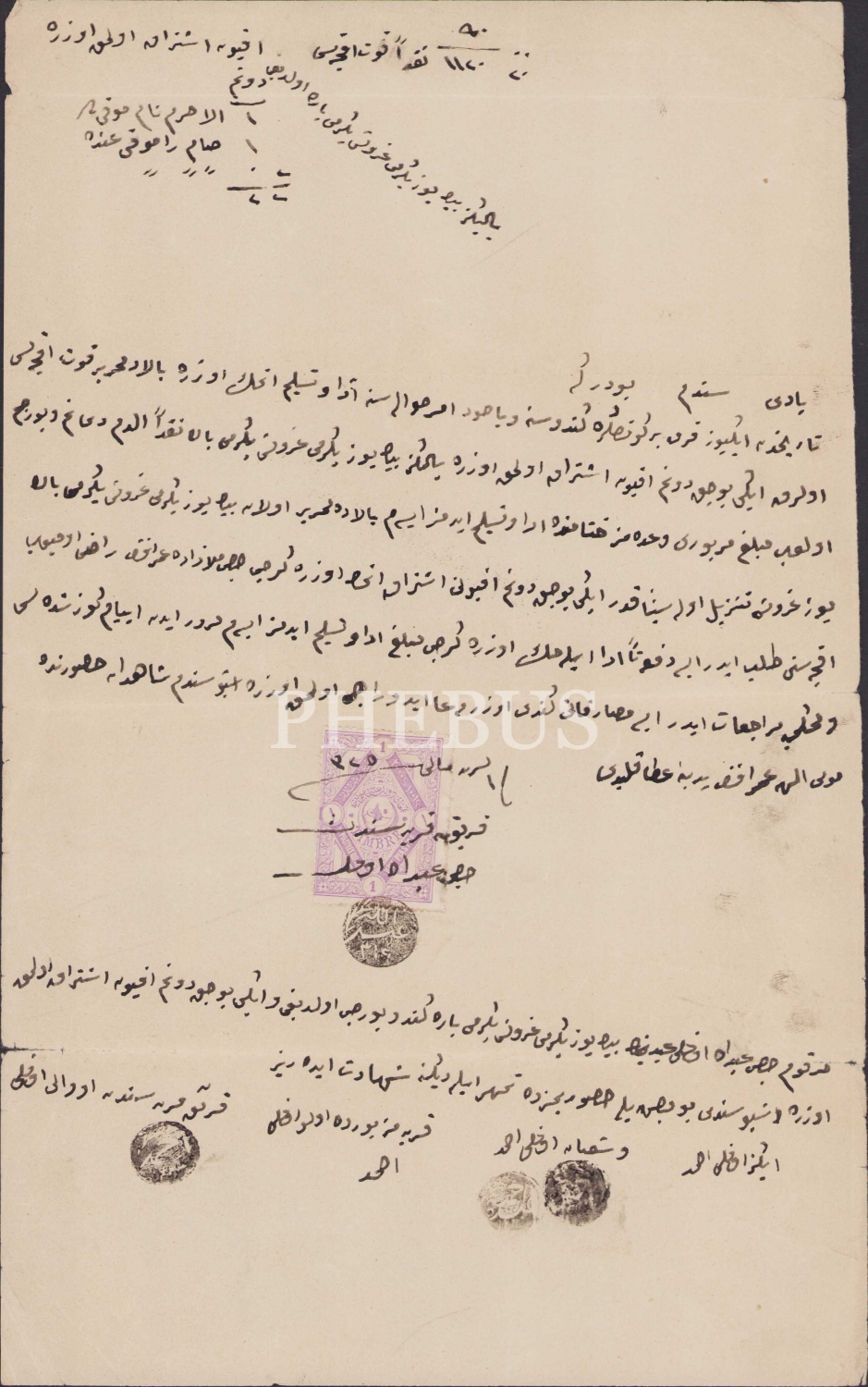 Osmanlıca senet metni, Hacı Abdullah Efendi'ye ait, 1325 tarihli, damgalı ve pullu, 18x29 cm.