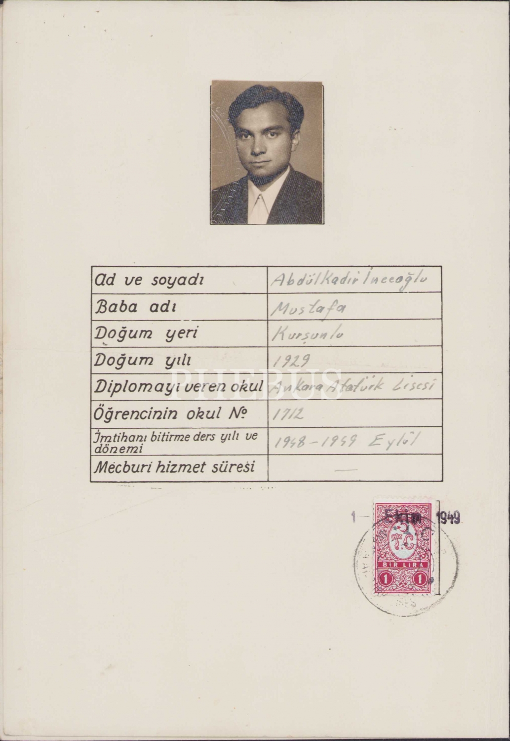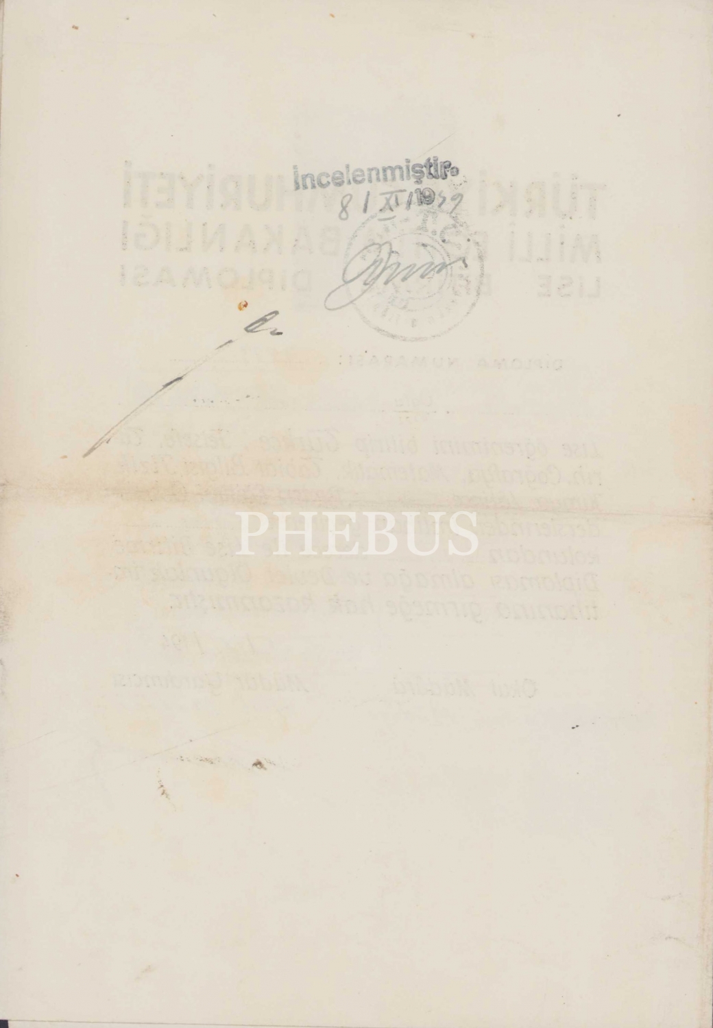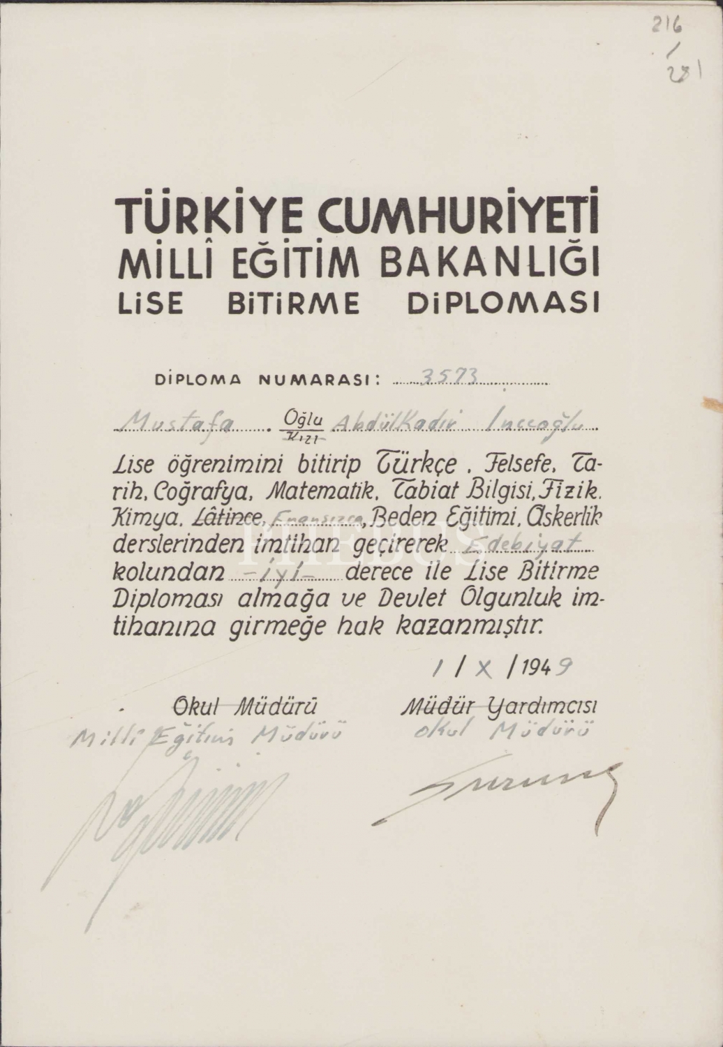 Türkiye Cumhuriyeti Milli Eğitim Bakanlığı Lise Bitirme Diploması, 1949 tarihli, 34x24 cm.