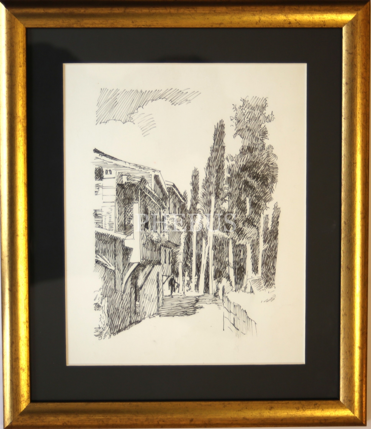 Mürekkeple tarama resim çalışması, ahşap evler, paspartulu, çerçeveli, 19x25 cm.