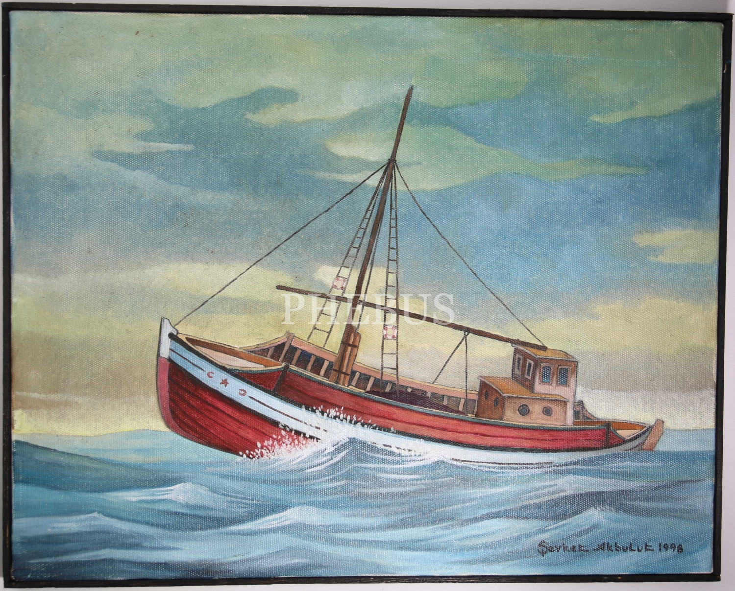Şevket Akbulut imzalı "Karadeniz Takası (Çektirme)", 1998 tarihli, 49x39 cm.