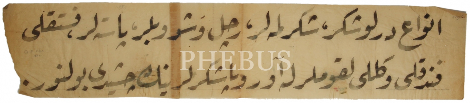 Celi Rika Yazı, "Envai türlü şeker, şekerlemeler, reçel ve şuruplar, pasta, fıstıklı fındıklı ve güllü lokumlarla Avrupa şekerlerinin çeşitleri bulunur", Hattat Halim Özyazıcı terekesinden, 62x13 cm
