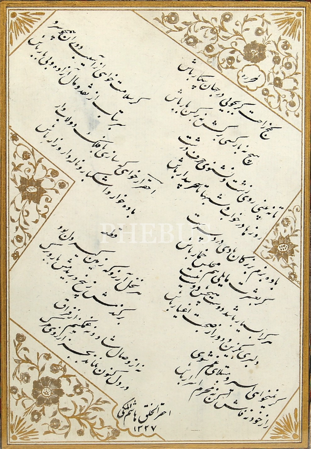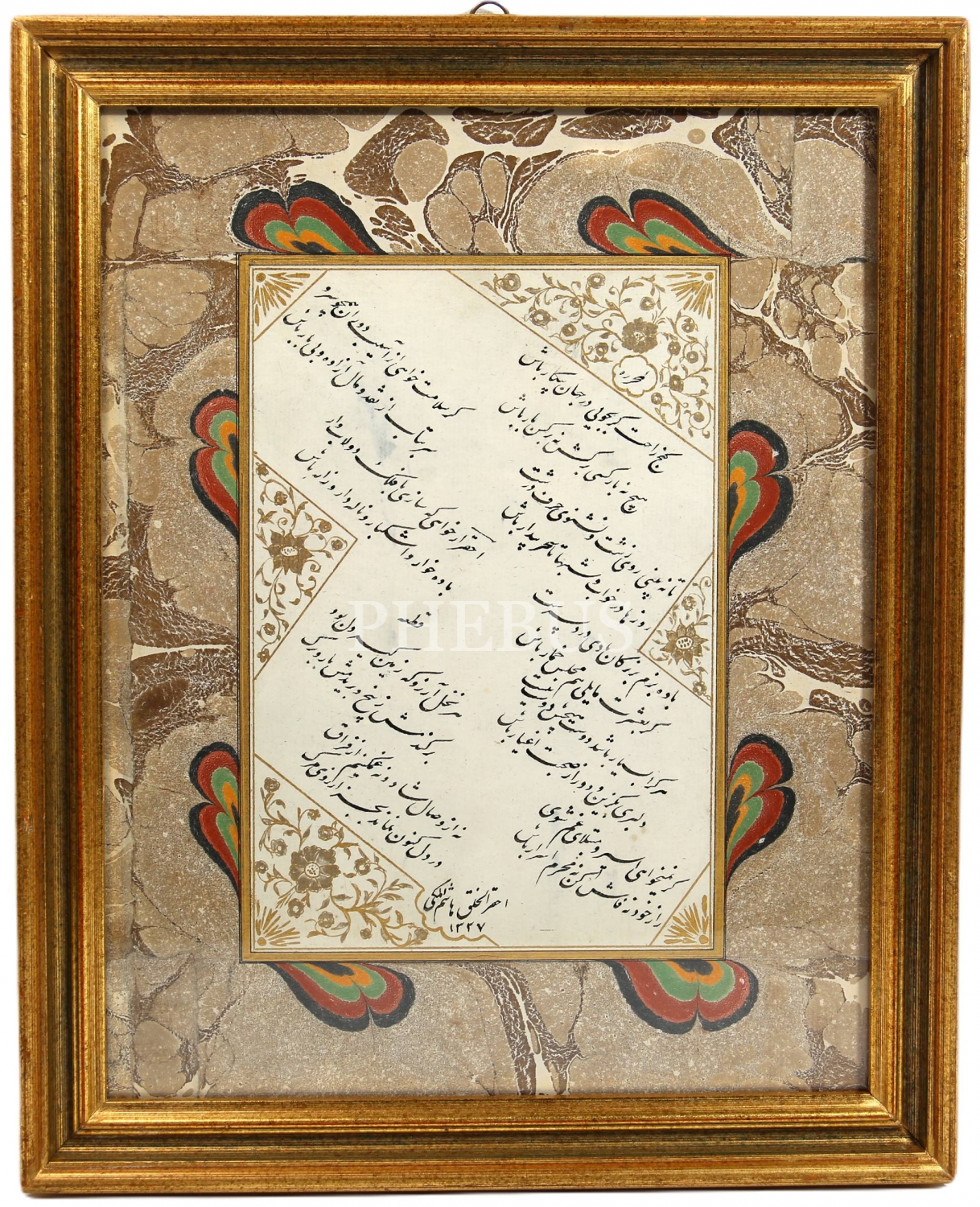 Talik levha, Hattat Haşim Mekki ketebeli, 1337 tarihli, altın tezhipli, ebrulu, çerçeveli, 13x21 cm