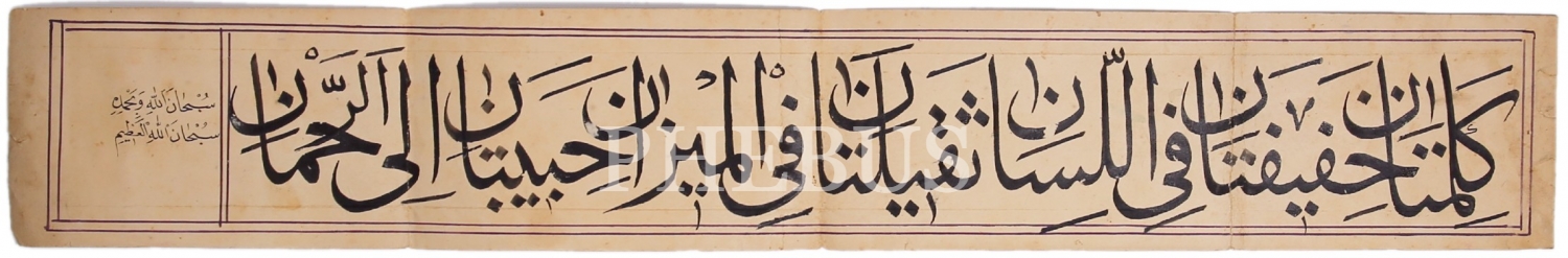 Sülüs Hadis-i Şerif, "İki kelime vardır ki dilde hafif mizanda ağır, Allah katında çok sevilendir", 60x9 cm