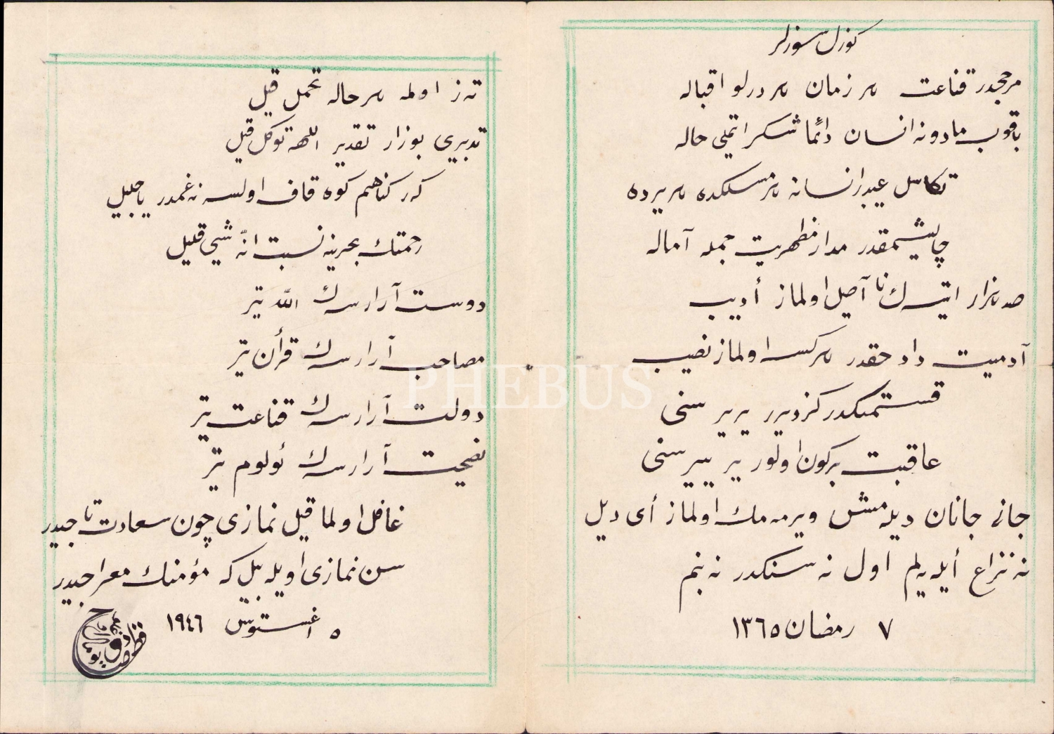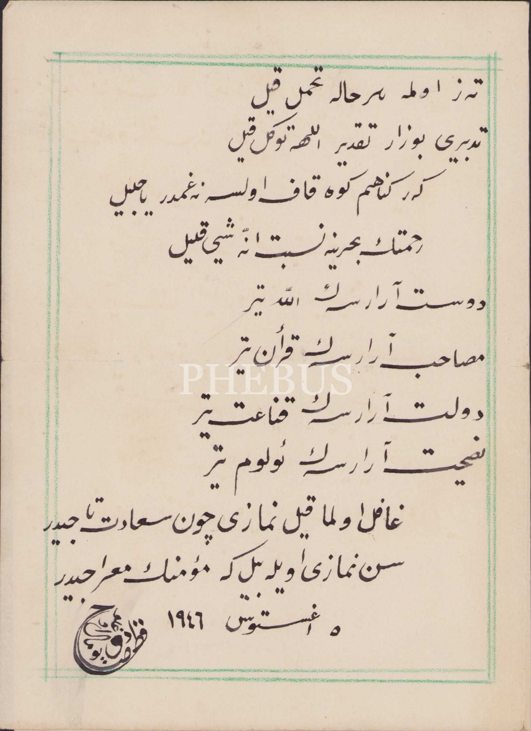 Talik şiir, 1946 tarihli, Hafız Sadık Yumaloğlu ketebeli, 28,5x20 cm