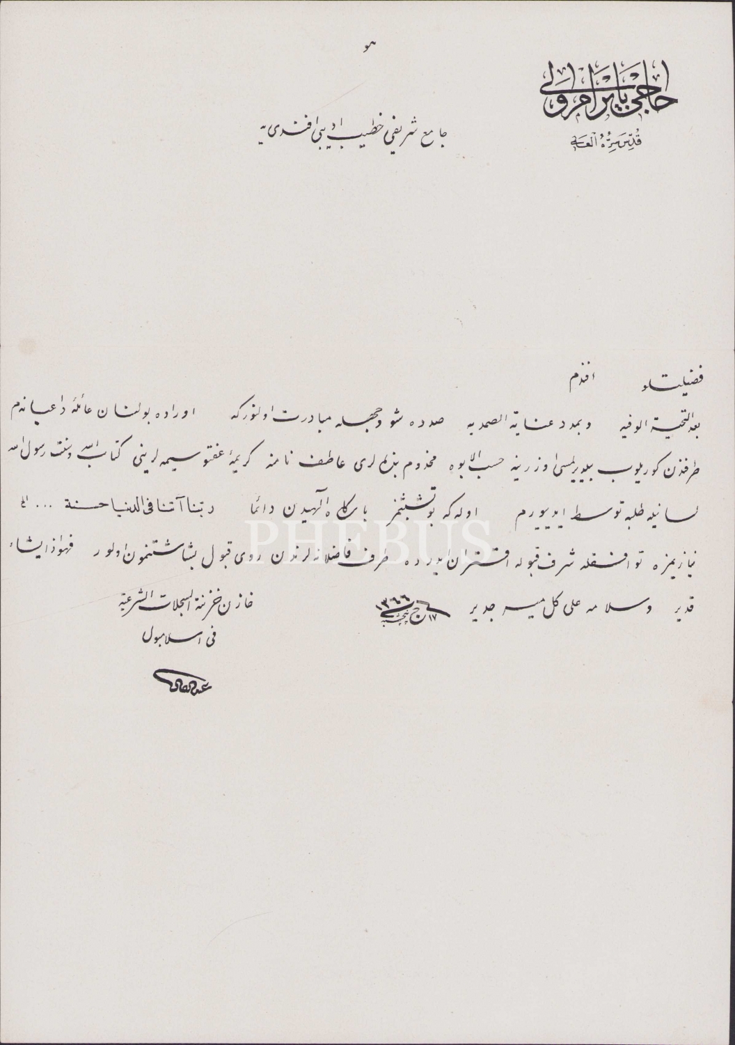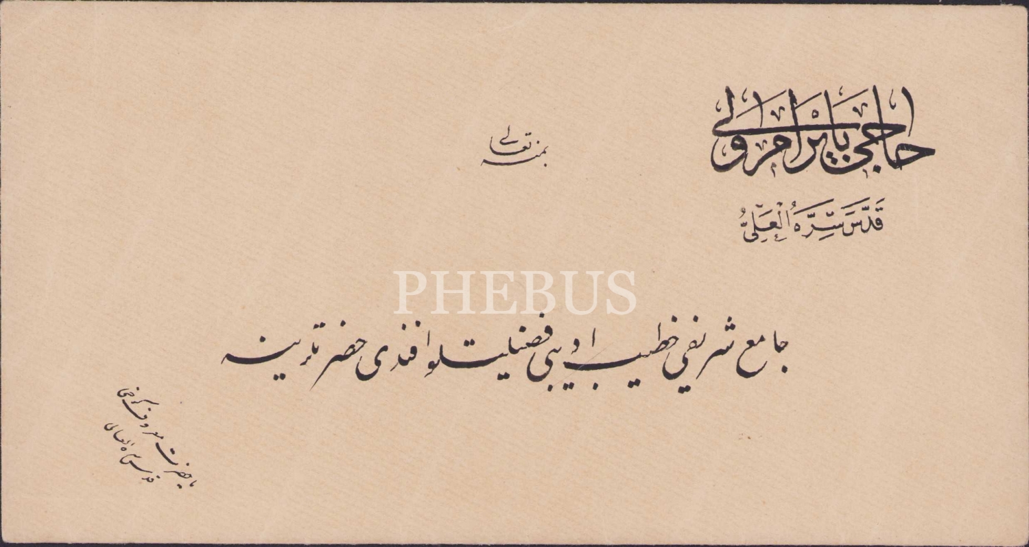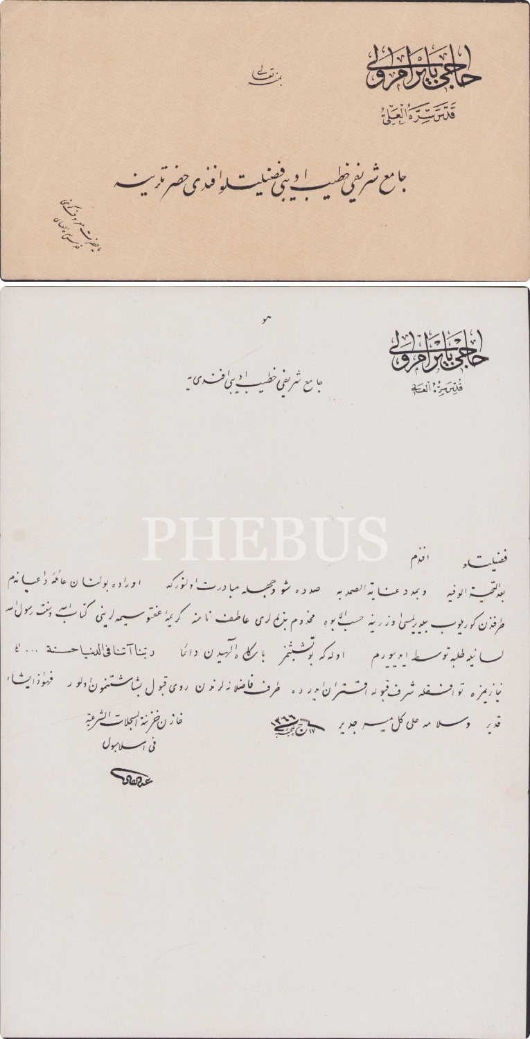 Hattat Abdülkadir Saynaç Efendi'nin Hacı Bayram-ı Veli Camii Hatibine, kendi hattıyla hazırladığı zarf ve mektup, Abdülkadir ketebeli, zarf 20x12, kağıt 20x28 cm'dir.