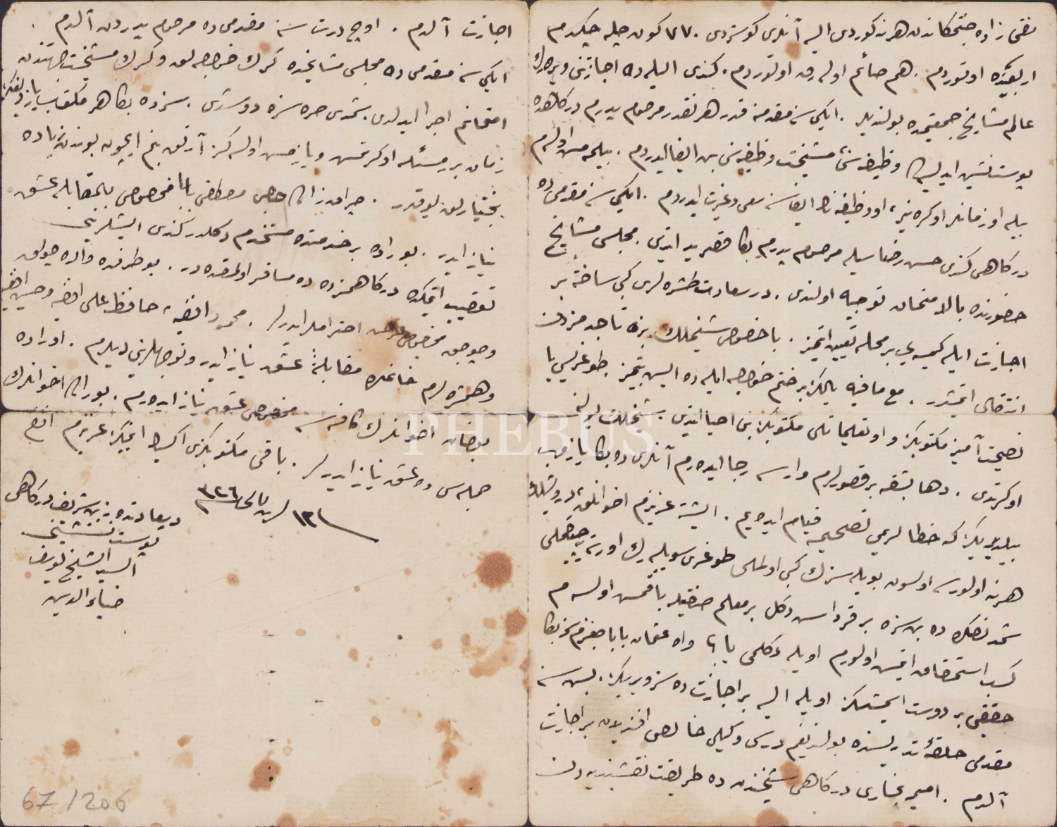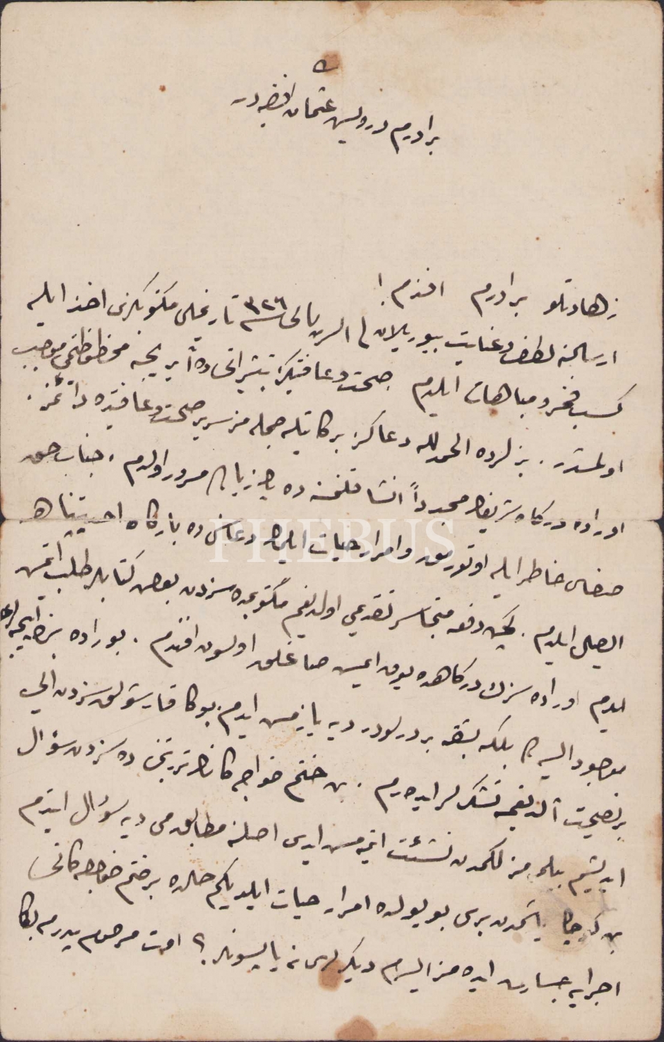 Taş Kasap Zıbın-ı Şerif Dergahı Postnişin Es-Seyyid Eş-Şeyh Yusuf Ziayeddin Efendi tarafından 'Biraderim Derviş Osman Efendi' hitabıyla yazılmış Osmanlıca mektup, 1326 tarihli, 13x20 cm