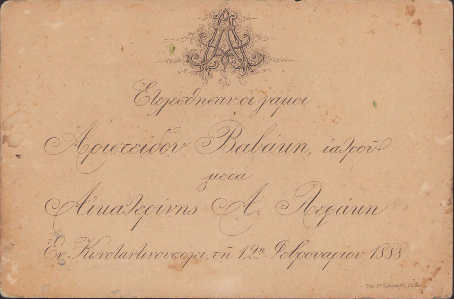 Rumca, 1888 tarihli, inisiyalli, Constantinople baskı davetiye