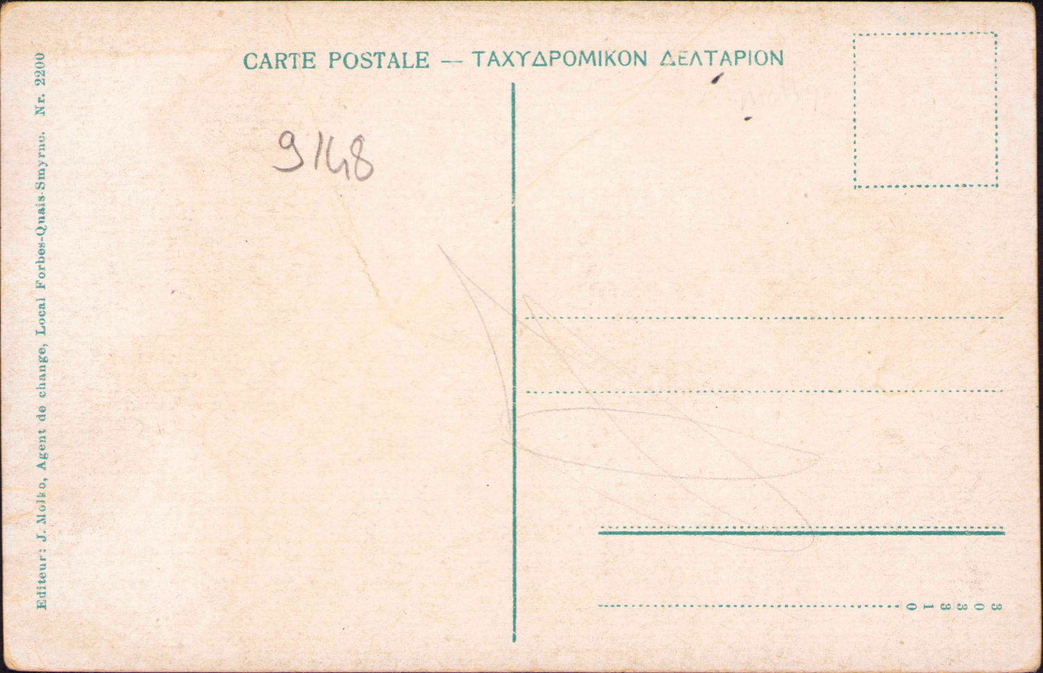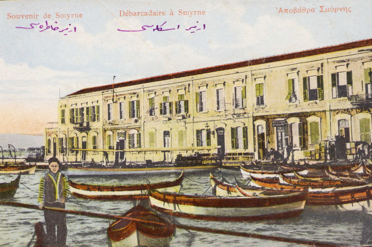 İzmir iskelesi genel görünüm, ed., J. Molko, Agent de Change, Local Forbes-Quais- Smyrne, Osmanlıca-Fransızca yazılı