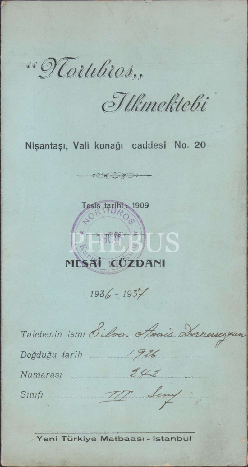Nortibros İlk Mektebi Mesai Cüzdanı, 1936-1937 damgalı, Yeni Türkiye Matbaası, İstanbul, 32x21 cm.