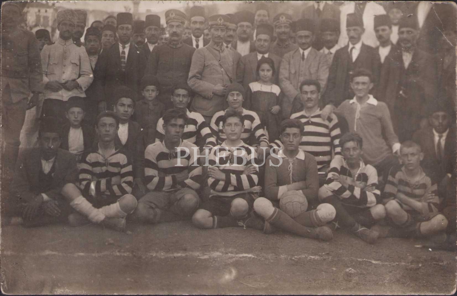 Eski dönem genç futbol takımı ve askerler hatıra fotoğrafı.
