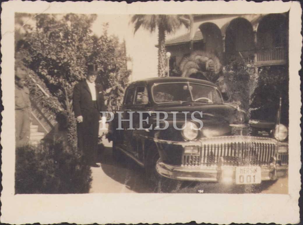 Mersin 001 plakalı araç yanında smokinli beyefendi, 9x6 cm.