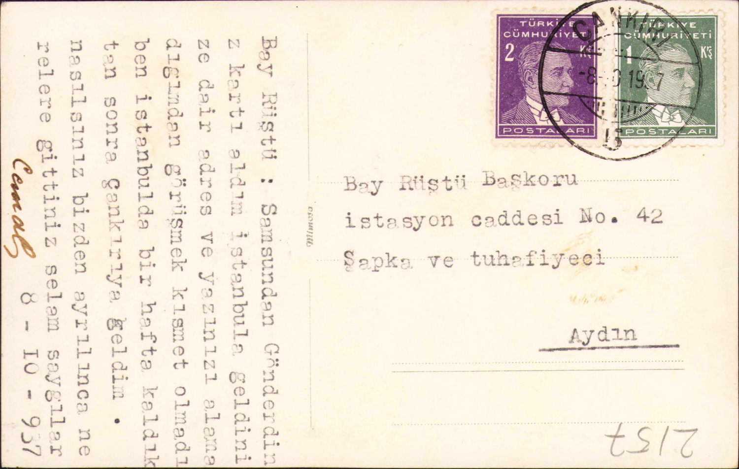 Çankırı İstasyon Caddesi kartı, postadan geçmiş damgalı, 1937 tarihli
