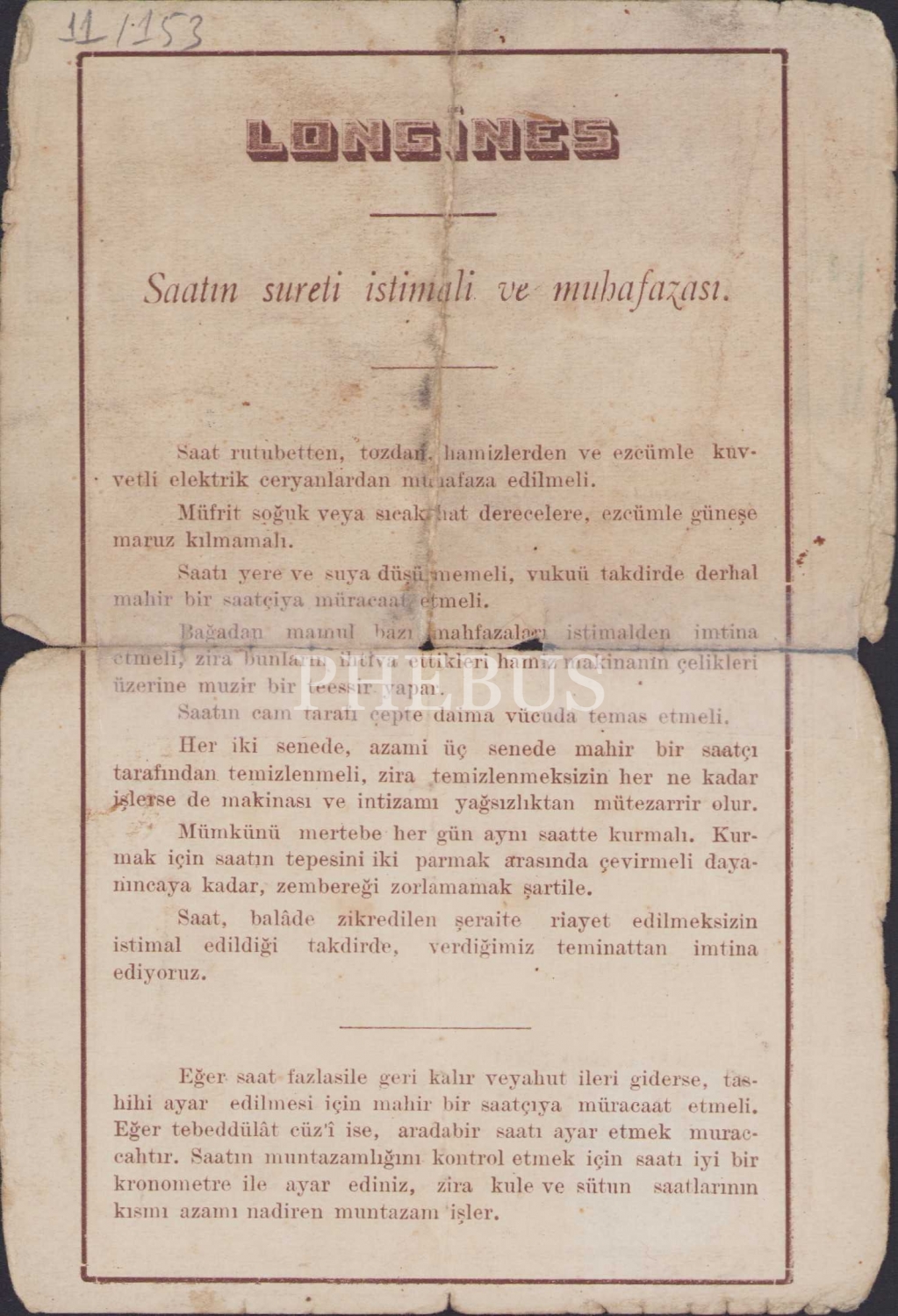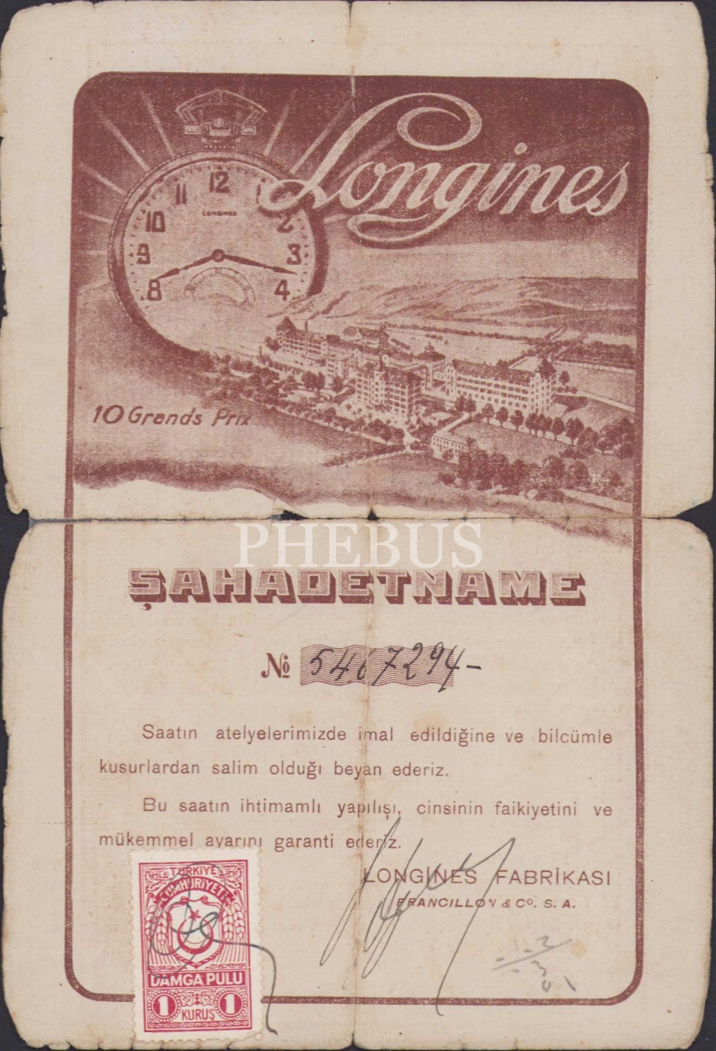 Longines Saatleri garanti belgesi, damga pullu, haliyle, 12,5x18 cm.
