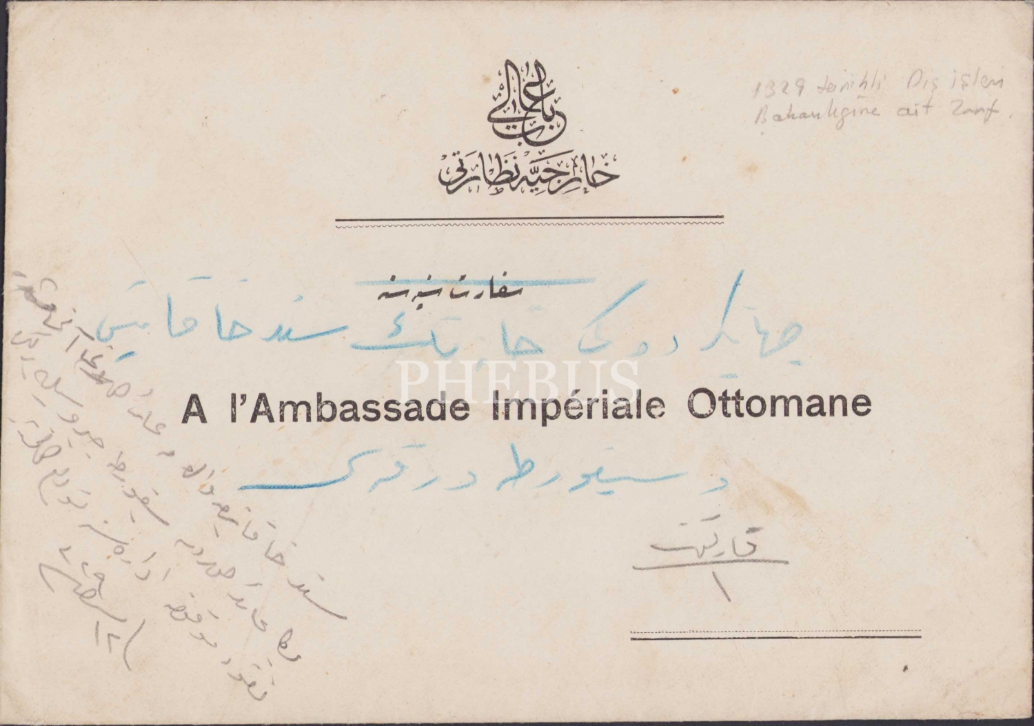 Hariciye Nezareti antetli, Franszıca 'A l'Ambassade Imperiale Ottomane' yazılı zarf, 24x17 cm.
